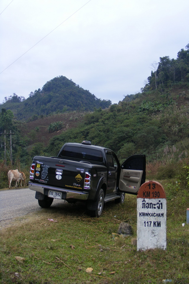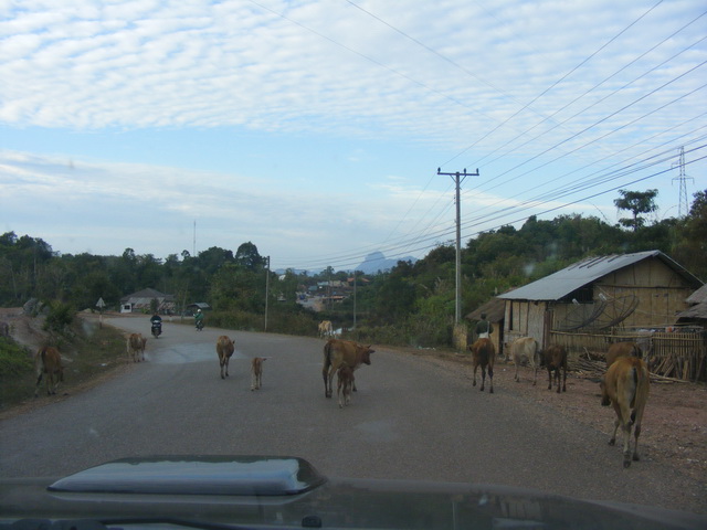 แต่พอหลุดจากแหล่งชุมชนของเวียงจันทร์เท่านั้นแหละท่านที่เคารพ การจราจร ก็กลายเป็นการจราจลทันที ทั้งคน,มอเตอร์ไซด์,จักรยาน,ควาย,วัว,แพะ,แกะ,เด็ก,รถยนต์ ชิดขวาก็งงพออยู่แล้ว ยังมาเจอสิ่งกีดขวางตามจังหวะอีก สะบายดีเวียงจันทร์จริง ๆ (ทุกคนทำอะไรก็ได้บนถนนตามสบาย) ไม่มีใครบีบแตรไล่ใครจริง ๆ ทุกคนใจเย็นมาก จอดรอด้วยความสงบ รวมทั้งพลเมืองใหม่แบบผมด้วย