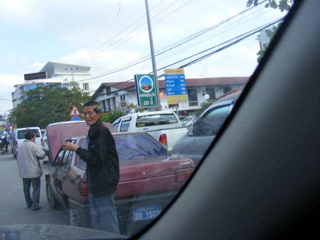 ก่อนถึงหอคำ นิดหน่อยก็เจออีกแล้ว สะบายดีเวียงจันทร์ ช่องจราจรเหลือช่องซ้ายสุดช่องเดียว