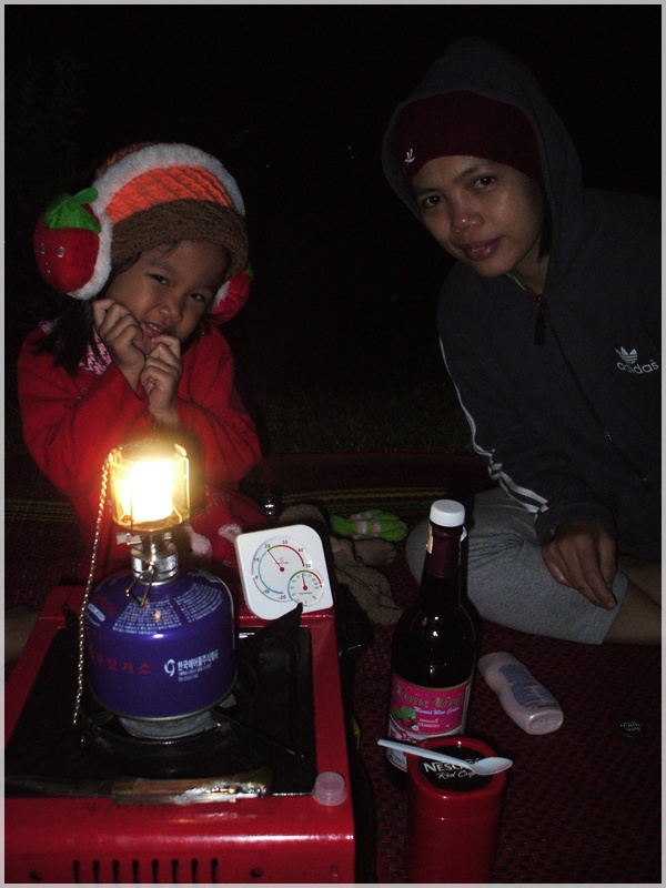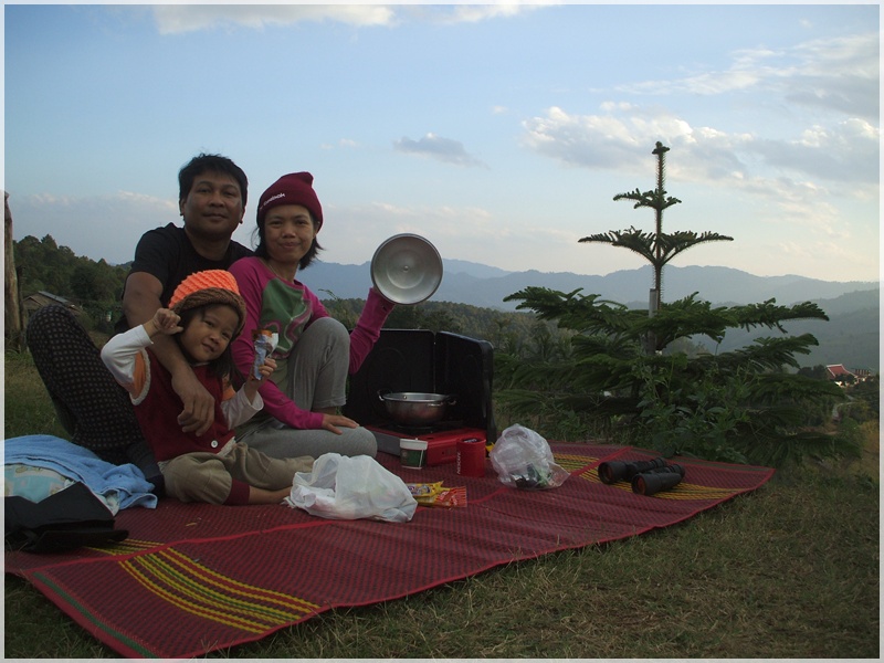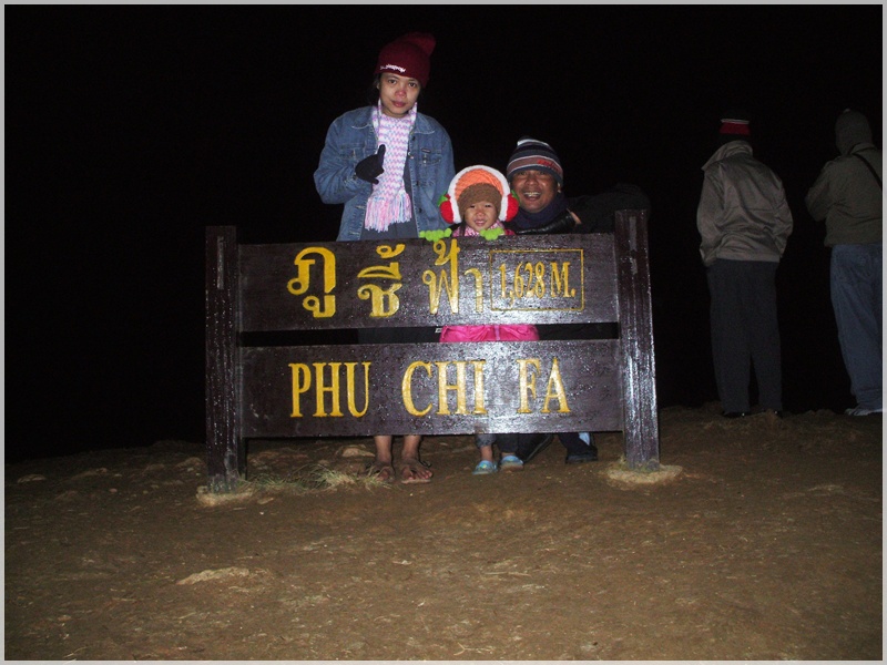 เรารีบนอนครับ..เช้าตี 4 เราก็ตื่นมาเตรียมตัวขึ้นรถไปข้างบน --> จากจุดกางเต็นท์-ไปทางเดินเท้าขึ้นภูชี้ฟ้า...จากทางขึ้นไปข้างบนยอดภู.ไม่ใกล้เลยครับ แต่เราสาม พ่อ แม่ ลูก ก็ฝ่าฟันสู้ลมหนาวจนมาถึงยอดครับ ..ตอนนี้ยังไม่ค่อยมีโครเท่าไหร่.
