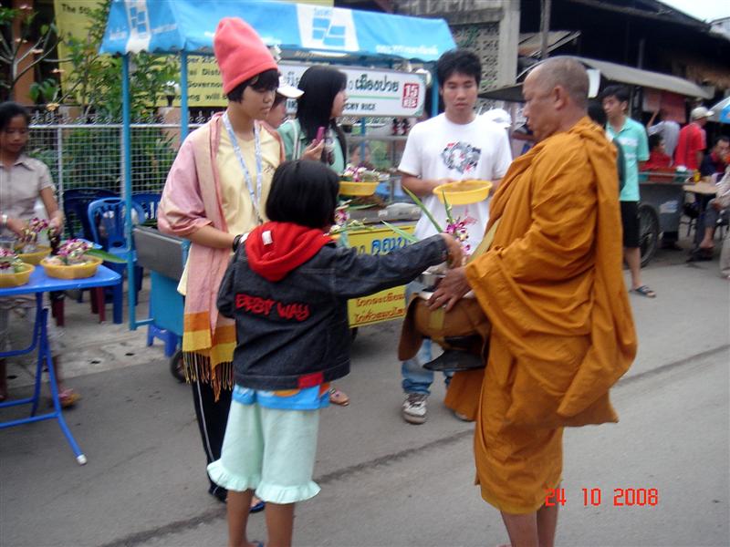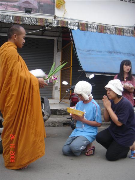 ใส่บาตร ทีหลังถอดรองเท้าด้วยเน้อ พระท่านไม่ได้ใส่เราต้องไม่อยู่สูงกว่าพระ