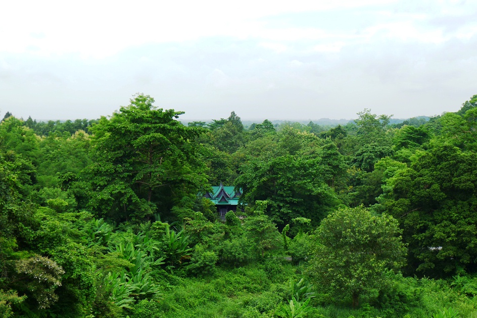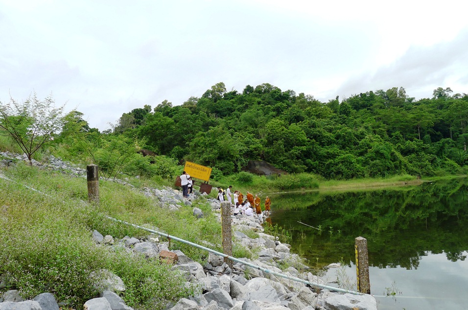มองลงไปจากอ่างเก็บน้ำ เห็นศาลาเรือนไทยของวัด