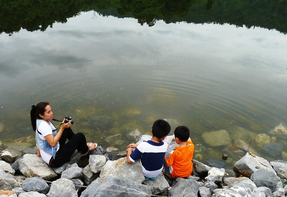 คุณแม่ถ่ายรูปลูกๆทำบุญปล่อยปลา