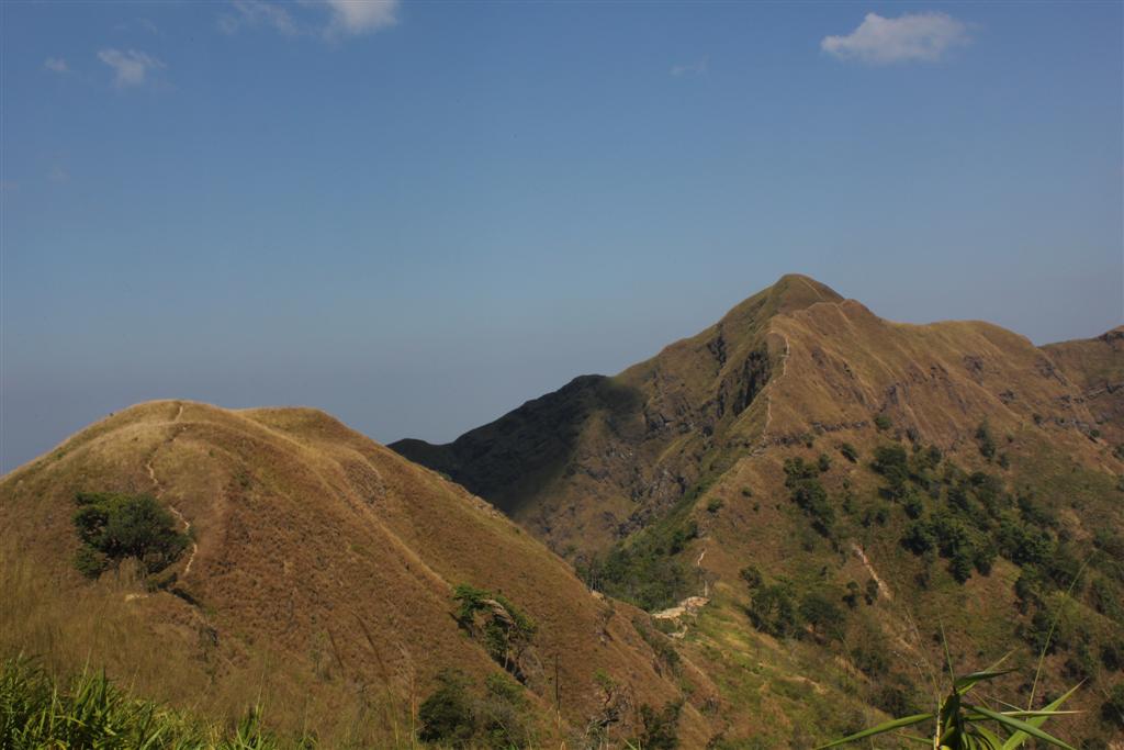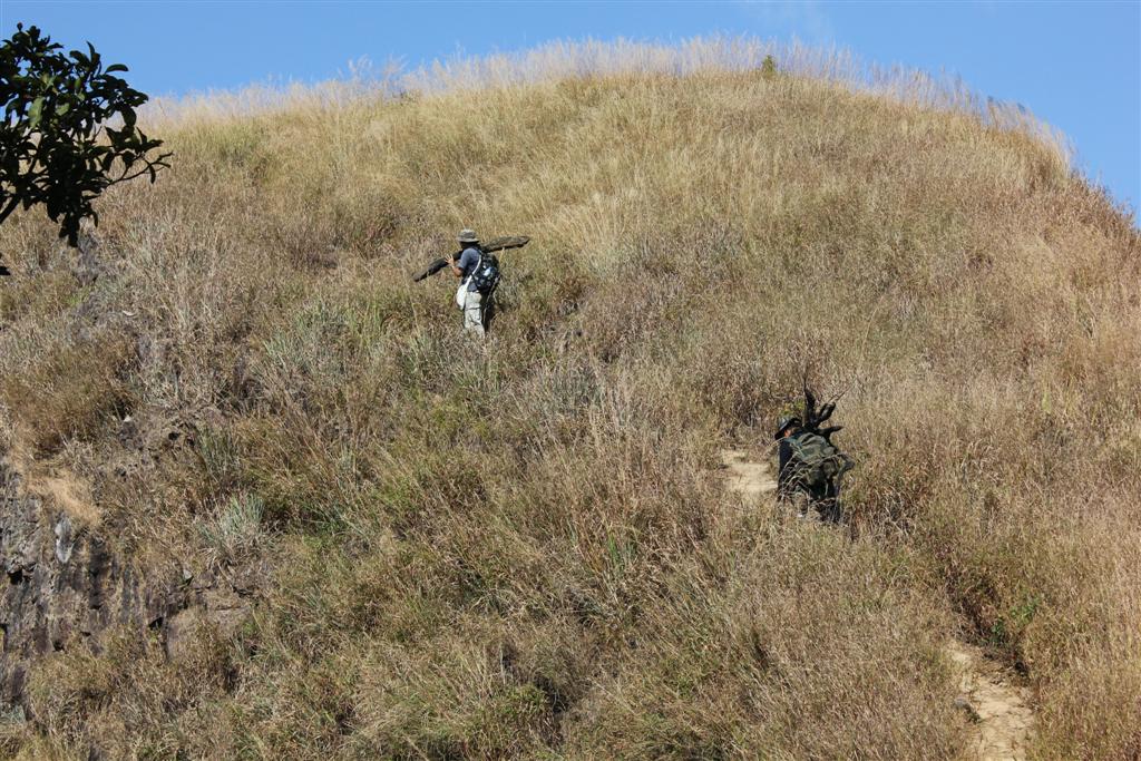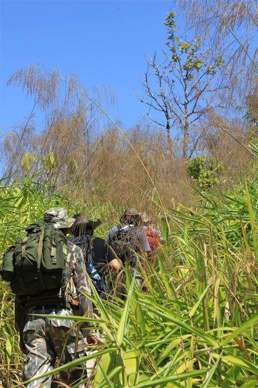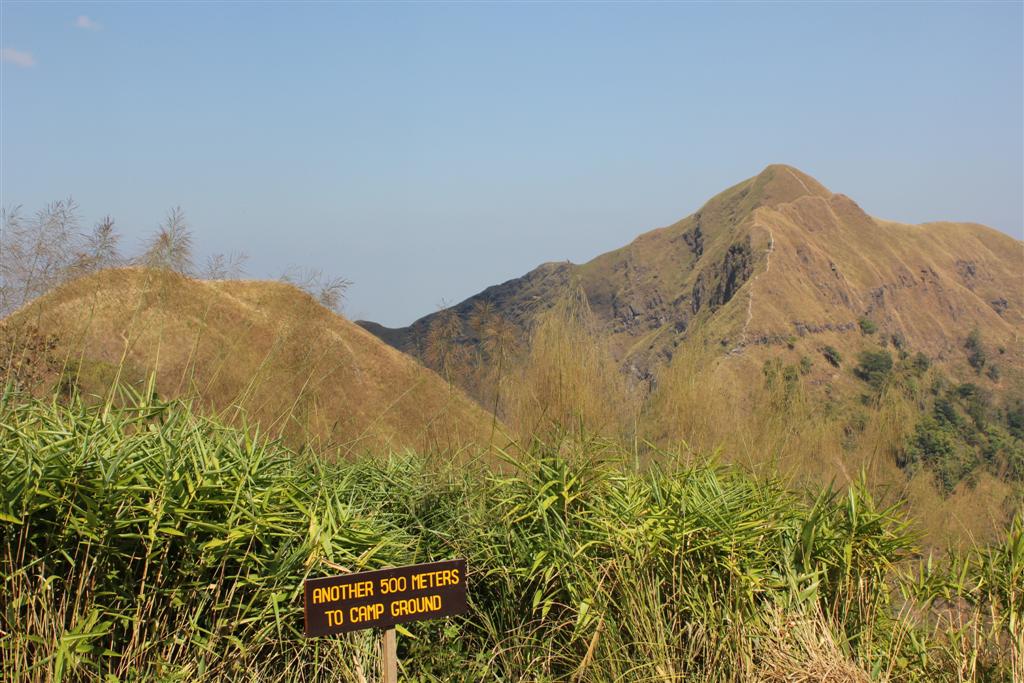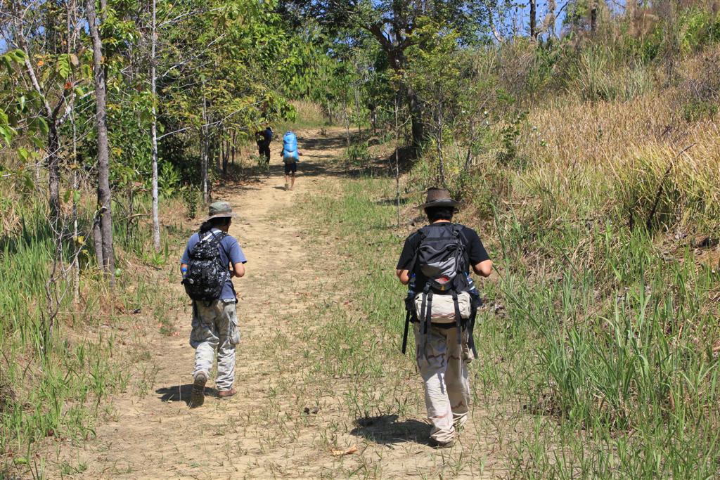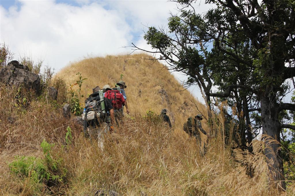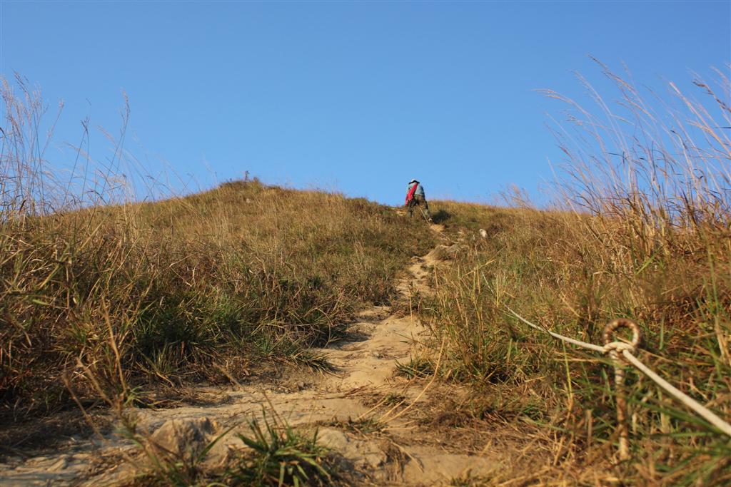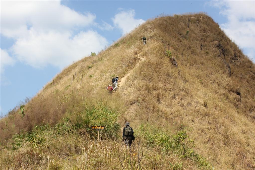 เลยครึ่งทางมาเล็กน้อยทางเริ่มจะชัน ขึ้นเนินเขาลงเนินเป็นช่วง ๆ อีกทั้งใม้ใหญ่หลบบังแดดเริ่มจะหายาก ขึ้น เป็นป่าหญ้าแห้งเฉา