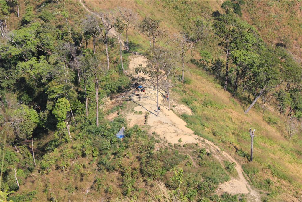 ลงเนินเขาช้างน้อยก็ถึงที่กางเต็นท์ ทางลงช่วงนี้ก็ยังชันอยู่ มีเชือก ปักหมุด โรยให้จับยึด ตลอด