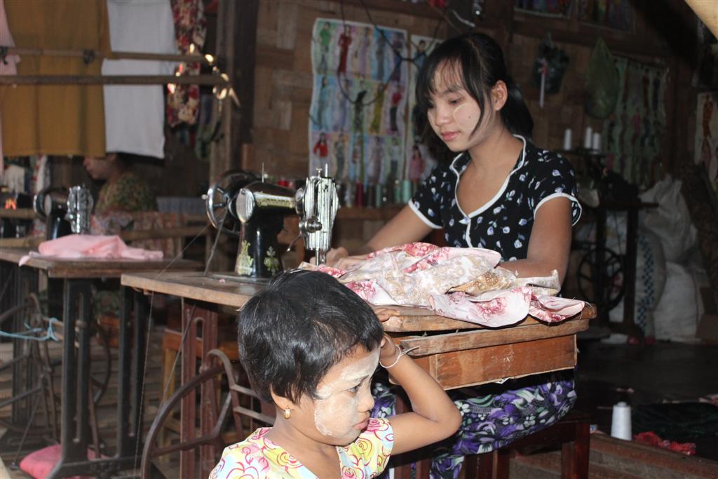 สาวสวยในตลาดสด นั่งเย็บผ้าด้วยจักรอยู่