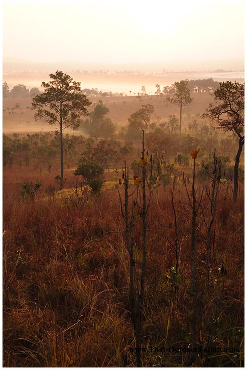 จากเขาค้อ เราขับรถเข้าทุ่งแสลงหลวง ทางหน่วยหนองแม่นา ระหว่างทางผ่านรีสอร์ทมากมาย บรรยากาศดูแล้วแห้งแล้ง มีแต่เขาหัวโล้นเป็นส่วนใหญ่ จนเข้าเขตอุทยานฯ ครับ ต้นไม้กลับมาเยอะอีกครั้ง และแล้วเราก็มาถึง ทุ่งหญ้า สะวันนา แห่งเมืองไทย