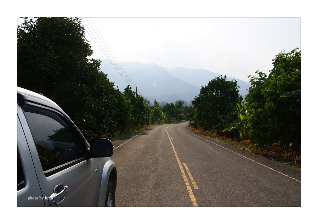 ข้างหน้าคือวัดเขาบรรจบ อีกไม่ถึง สอง กม. สองข้างทางเป็นสวนผลไม้