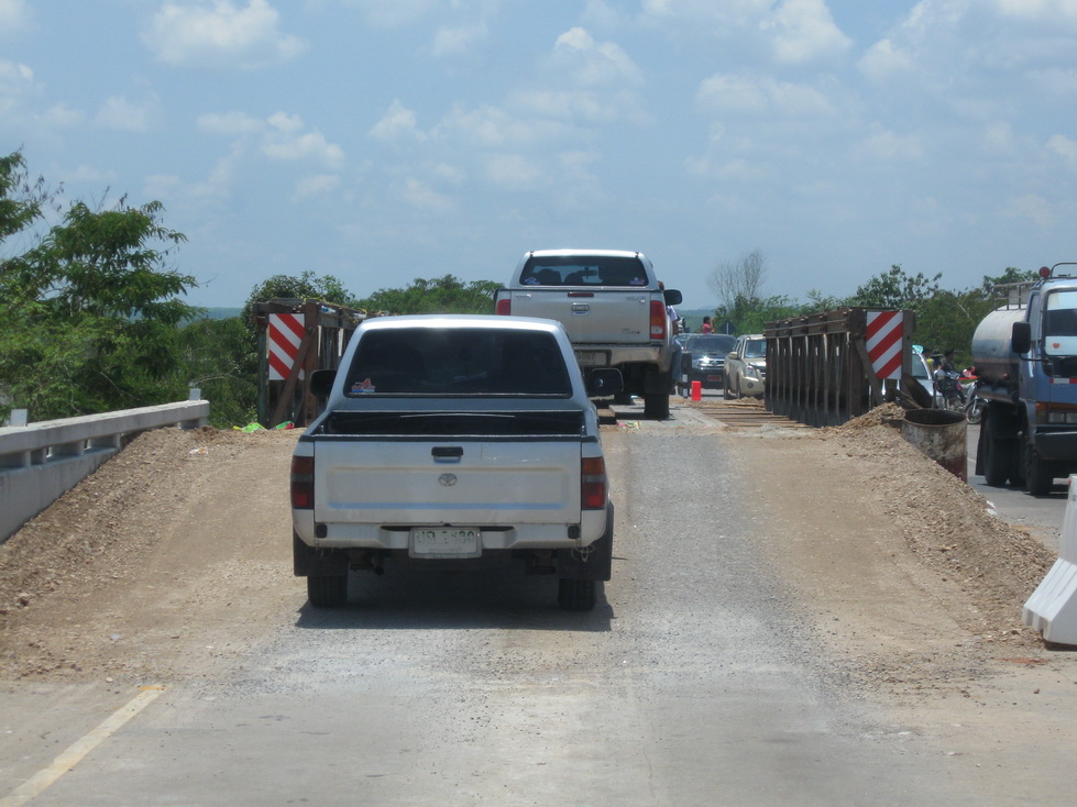 ด้านขาขึ้นที่เบี่ยงให้รถวิ่งสวนกัน คอสะพานชำรุด ต้องเสริมแบบนี้