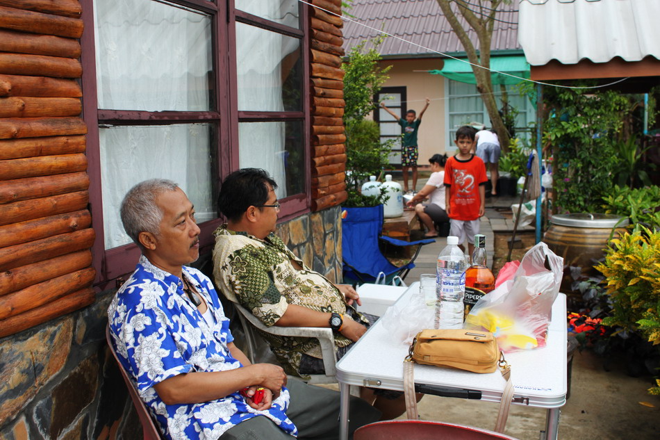 พอฝนหยุดเราก็มากางโต๊ะสนามกันหลังบ้าน จิบน้ำหวาน กาน