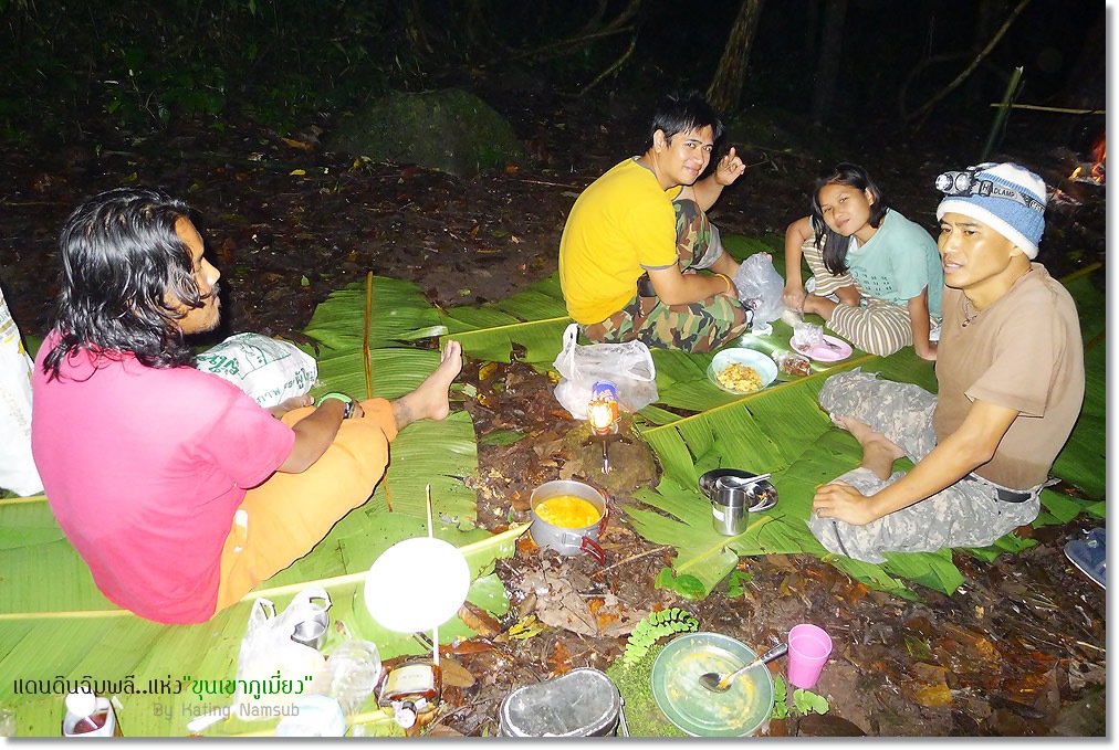 .. บรรยากาศ ยามค่ำคืน..ก็ ..นั่งสนทนา..กันมั่ง ..กรี๊ด..วี๊ดว้าย..กันมั่ง.. เนื่อง จาก..สภาพชื้น ชื้น ของป่า..ทำให้มี งู ตัวน้อย ตัวนิด..เลื้อยมา อาศัย ตามใบกล้วยที่ เอามา..รอง..ทีน่ะที่ อ.ยิ้มแป้นไม่ไปนั่งทำ..ไม่งั้น.......งูแบนนนนนน..ตาย..อิ อิ..