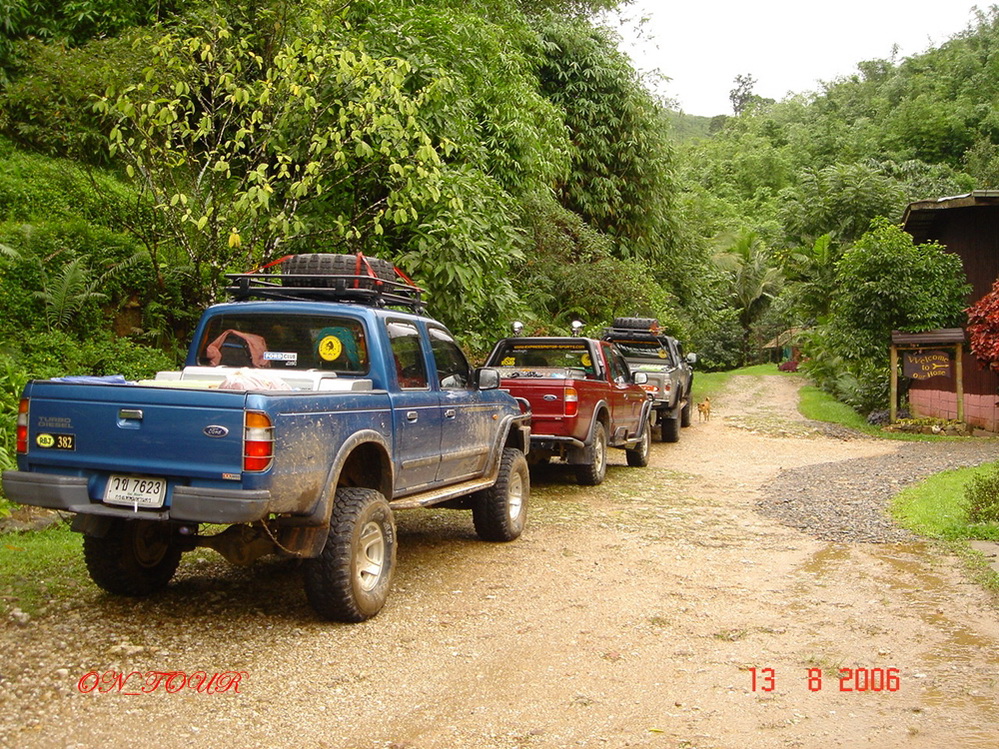 แล้วพวกเราก็มาเจอกลุ่มออฟโรดสามคันมีฟอร์ดสองคันดีโฟร์ดีอีกหนึ่งคันกันชนเหล็กไซด์เรียลยางมัดพร้อมๆกันทุกคันเลยครับ
