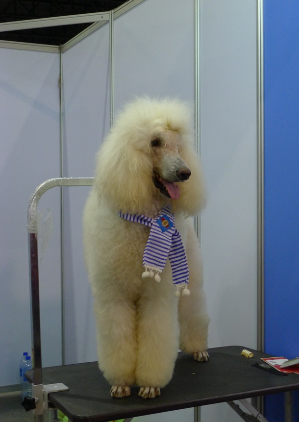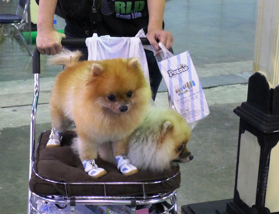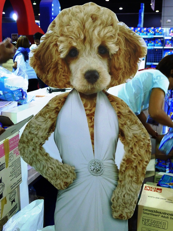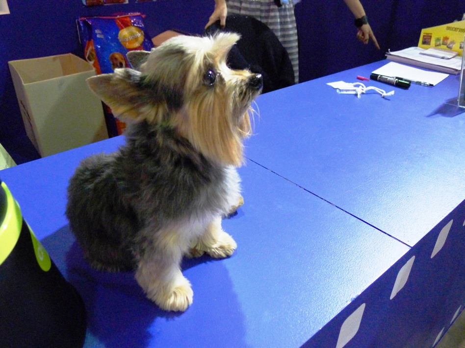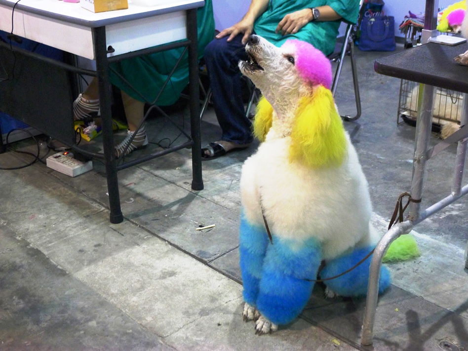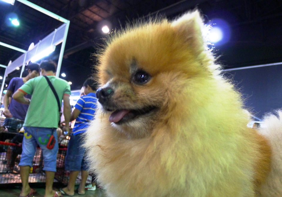 ข้างๆมีน้องหมาขนฟูแต่งตัวรอประกวด นั่งคอยพร้อมกับสัปงกไปด้วย