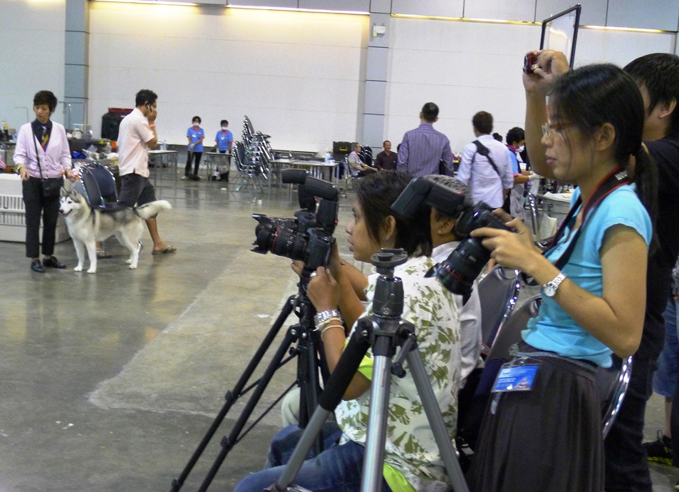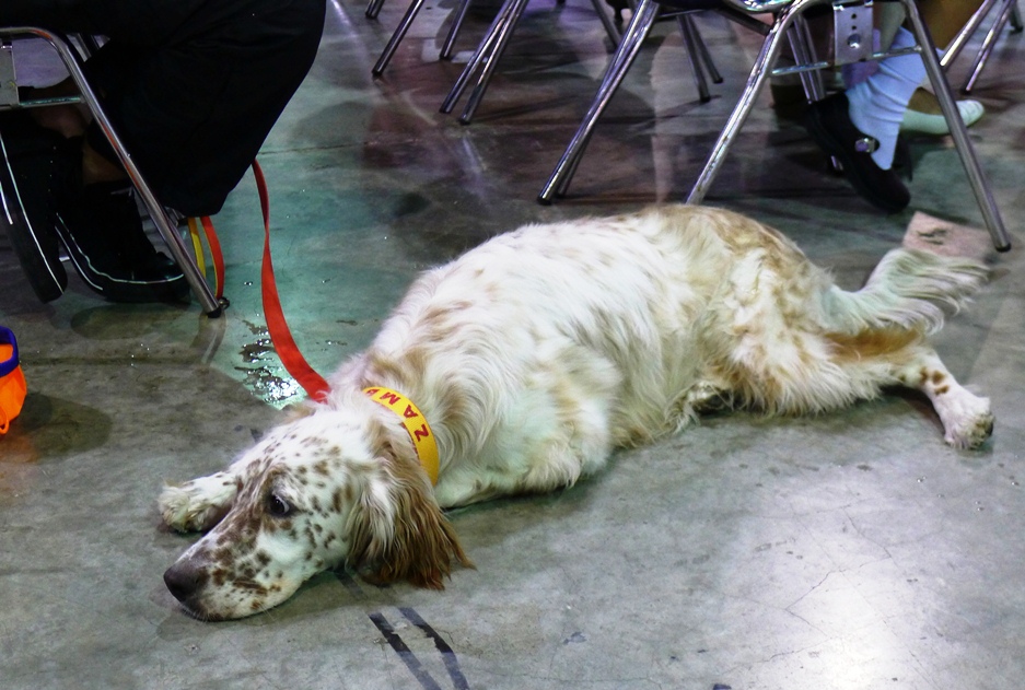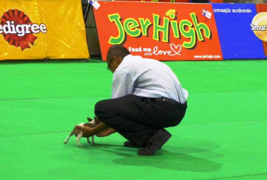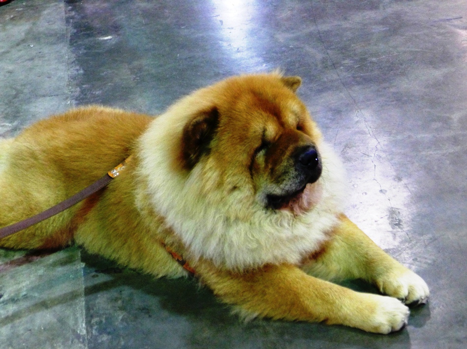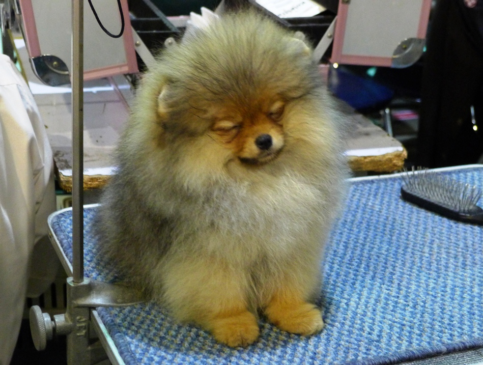 ข้างๆมีน้องหมาขนฟูแต่งตัวรอประกวด นั่งคอยพร้อมกับสัปงกไปด้วย