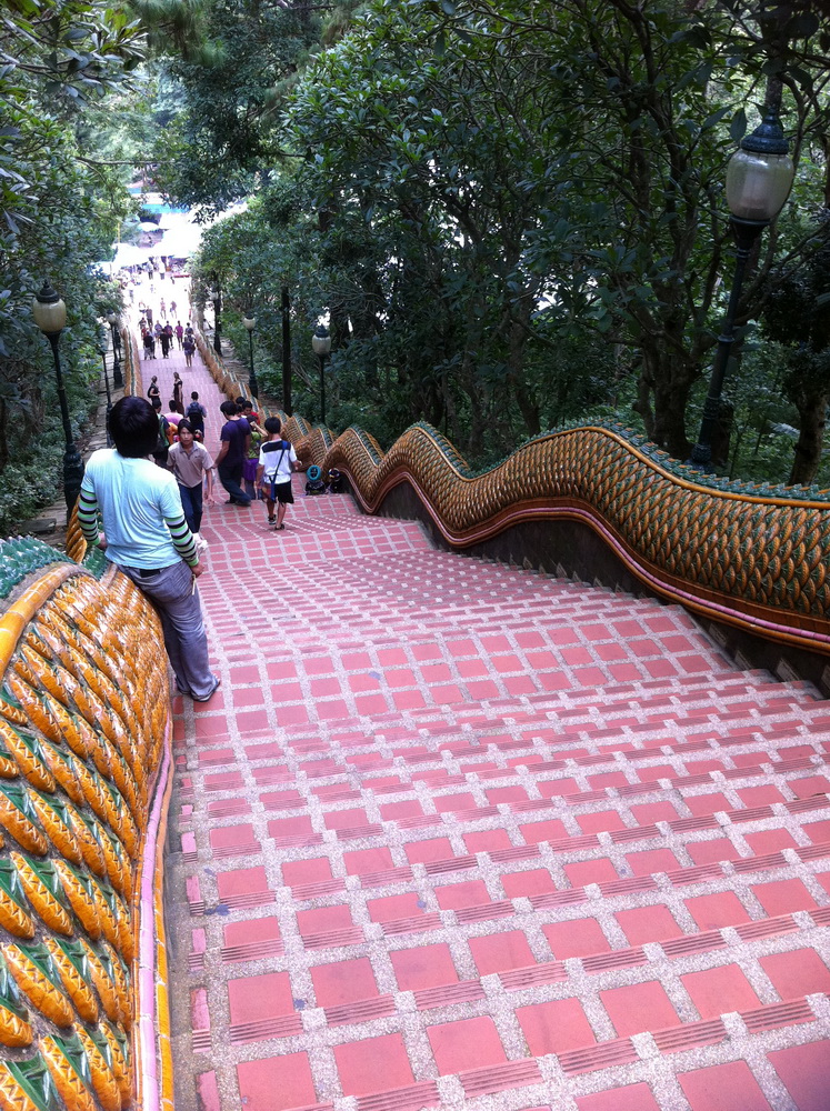 วันนี้คนน้อยมากเพราะไม่ใช่ช่วงท่องเที่ยว มีเพียงนักท่องเที่ยวเล็กน้อย บันไดนากขึ้นดอยเลยไม่พลุกพล่านเหมือนที่เคยเป็น ผมเลือกเดินขึ้นทางบันไดเพราะเค้าเล่าว่าได้บุญเยอะกว่าขึ้นทางรถราง