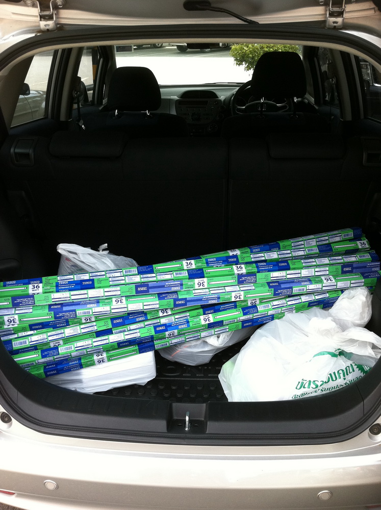 เริ่มจากซื้อของใส่เจ้าแจ๊สใหม่ วันนี้จะถวายหลอดไฟฟ้าวัดละ 6 หลอดครับ เค้าว่าเลย 6 เป็นเลขของพระอาทิตย์จะทำให้ แร้งมั๊ก ๆ ครับ ส่วนอื่น ๆก็จะเป็นของใช้จำพวกสบู่ยาสีฟันรองเท้าแตะ ....... ครับ