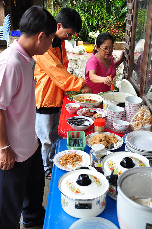หลังจากเติมพลังข้าวต้มยามเช้าเสร็จก็พากันเดินตามกำนันที่หิ้วปิ่นโตนำไปวัดสันนาเม็ง