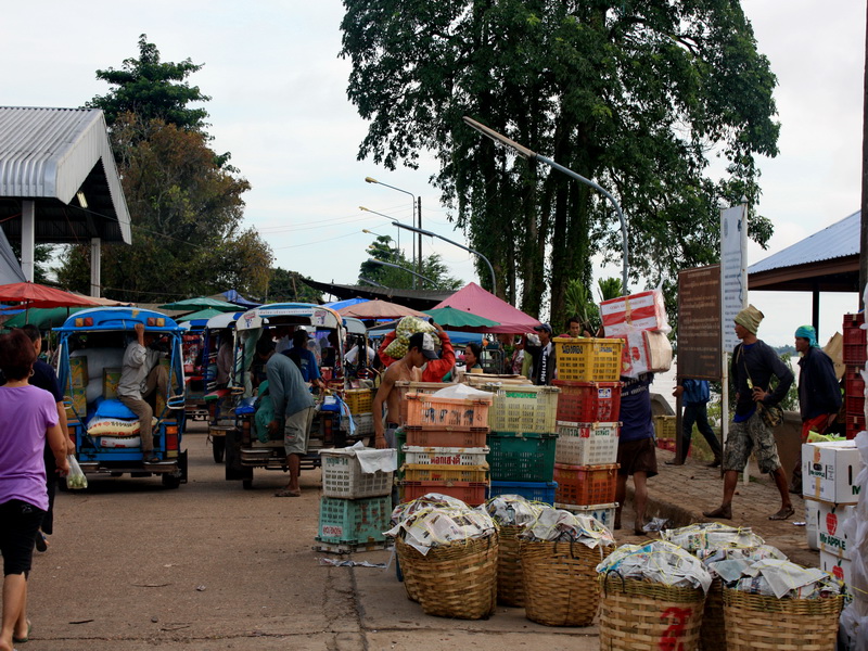 ตลาดเช้าริมโขงเมืองมุกดาหาร ฝั่งลาวเอาสินค้าพื้นบ้าน และ ของป่ามาขาย ฝั่งไทยก็ส่งของใช้ประจำวันข้ามไป แต่ที่ผมเห็นเป็นหลักคือผลไม้ตามฟดูกาลทุกชนิด ที่พ่อค้าแม่ค้าฝั่งเราขนลงเรือข้ามไปแบบมีเท่าไหร่เอาหมด