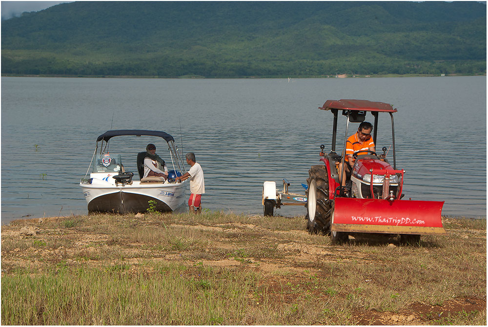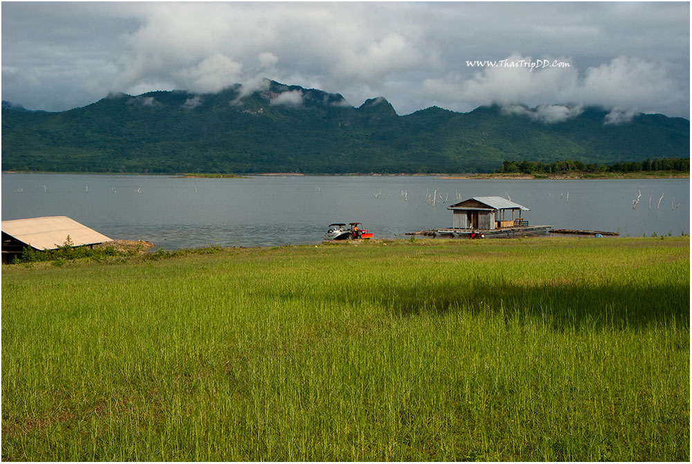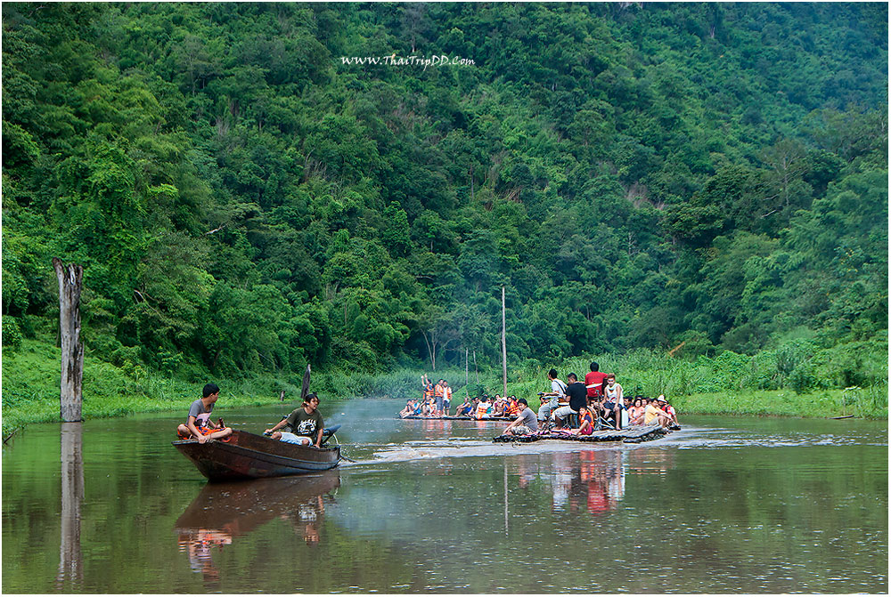 ใช้เรือหางยาวลากเที่ยวเป็นขบวนยาวเพื่อชมความงามของผืนน้ำและขุนเขาของเขื่อนศรีนครินทร์
