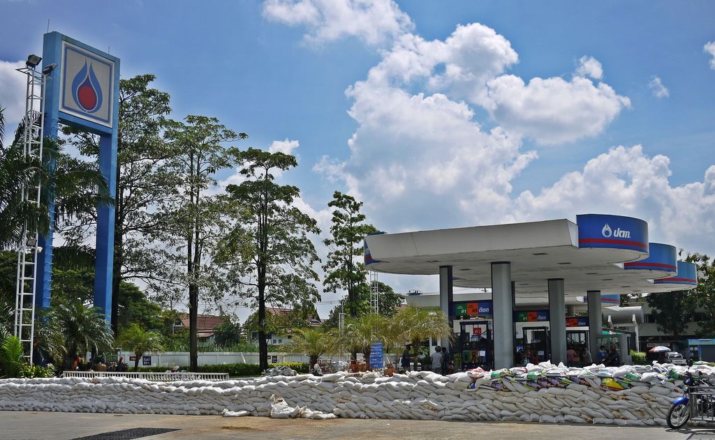 มีคันดินกับกระสอบทรายกั้นน้ำไว้