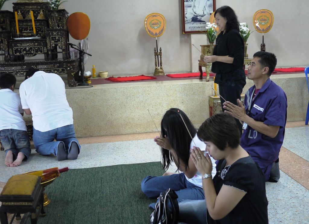 หน้าตาเคร่งขลึมค่ะ พยายามสวดมนต์ตามพระ แต่สวดไม่ทันเพราะพระท่านเร่งสปีดเร็วมาก...