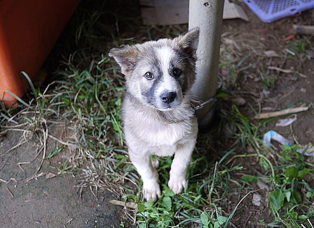 ลูกหมาตัวน้อยถูกผูกติดเสากันไปซุกซน