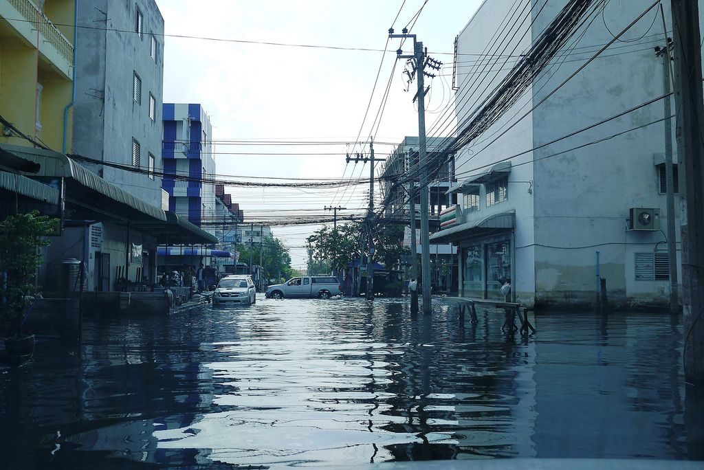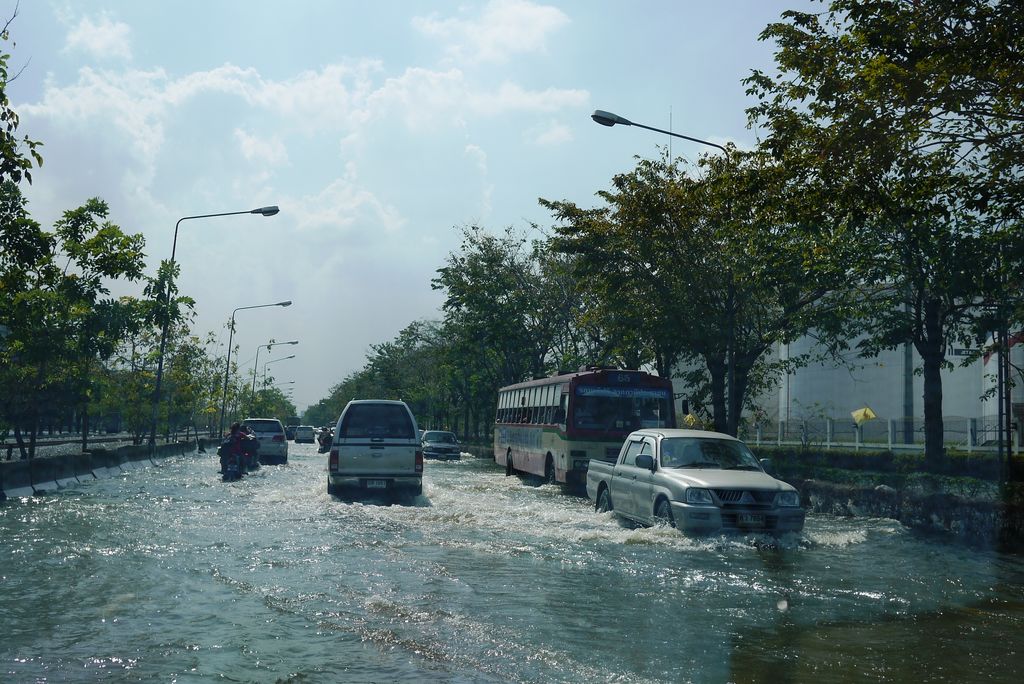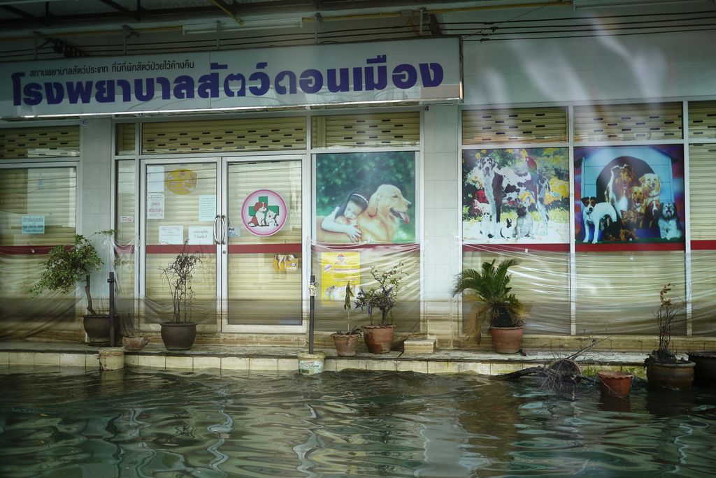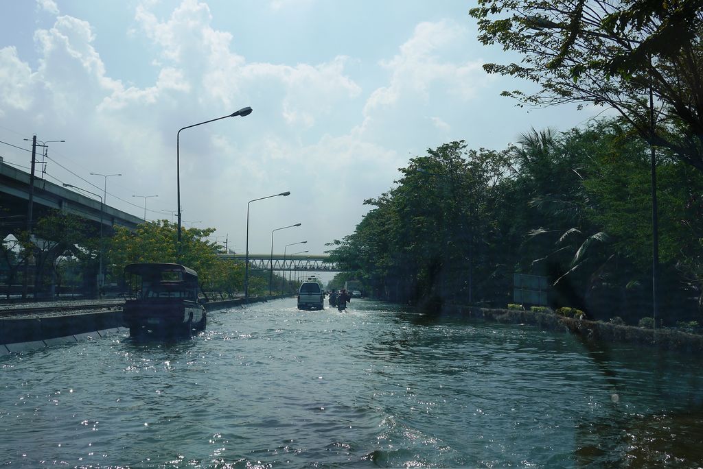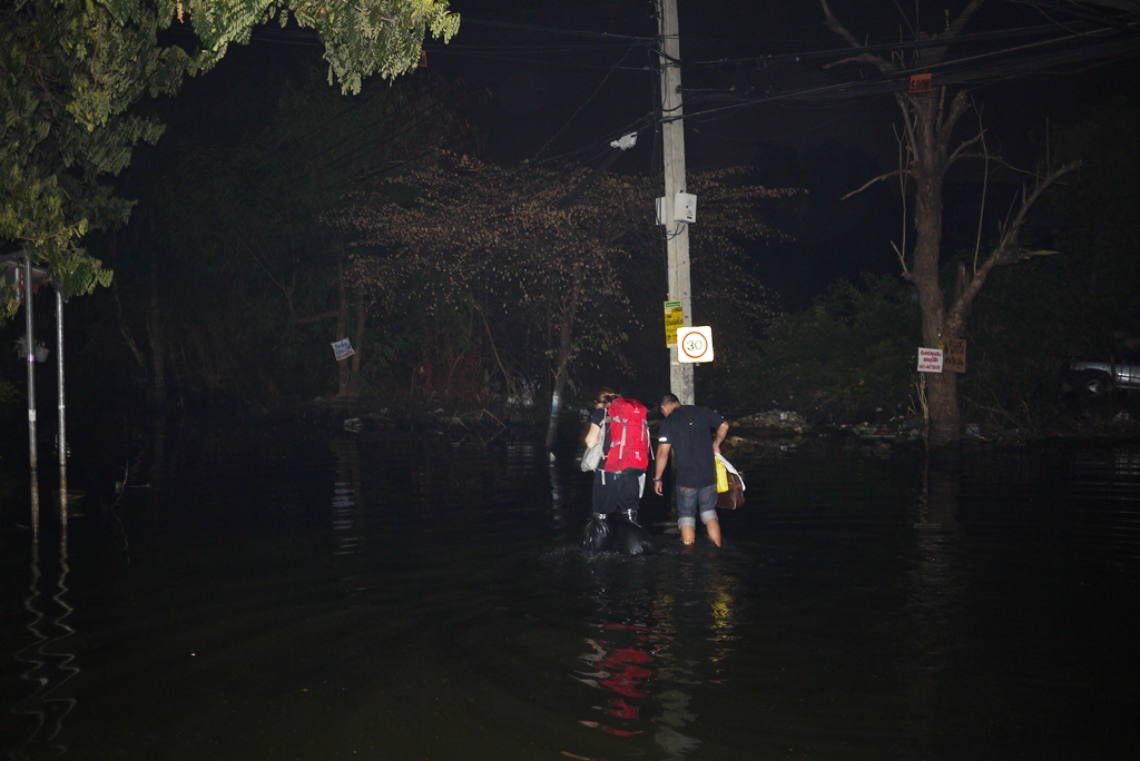 โชคดีพื้นตรงที่จอดรถด้านล่างคอนโดน้ำลดแล้ว เหลือแต่ตรงถนนระดับน้ำเกือบเข่า น้องที่ติดรถมาด้วยกันต้องลุยน้ำเข้าบ้าน