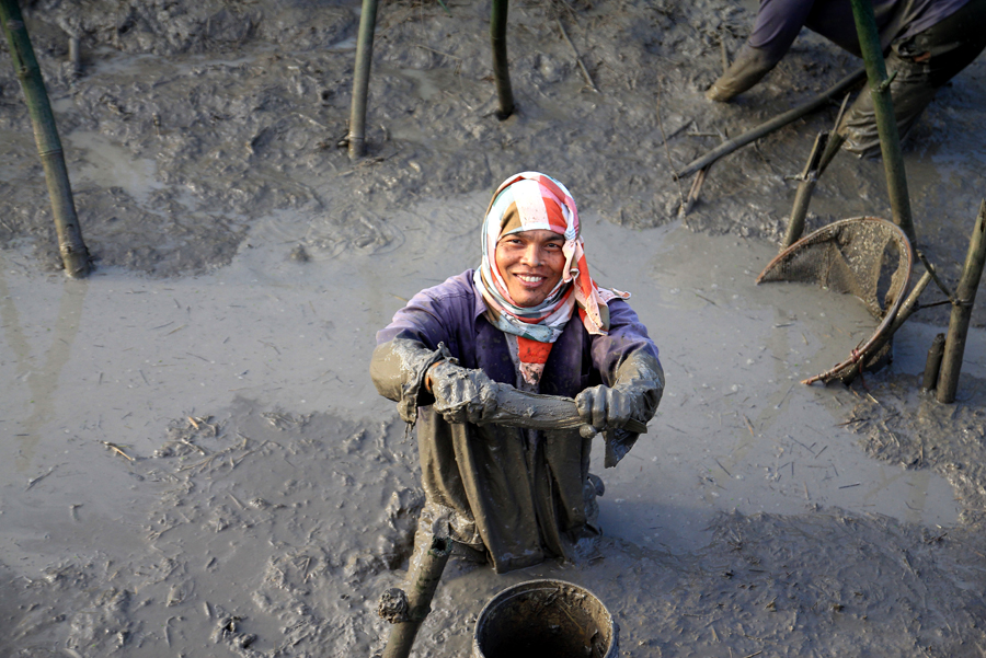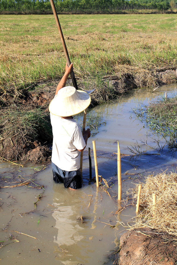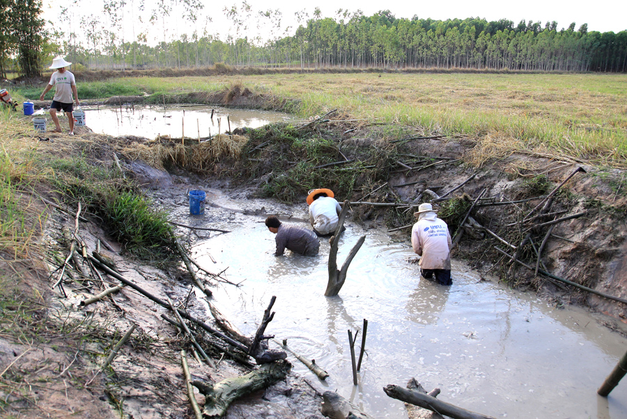 เลือกได้แล้วก็ลงมือปั้นดินกั้นบ่อไม่ให้น้ำไหลหากัน