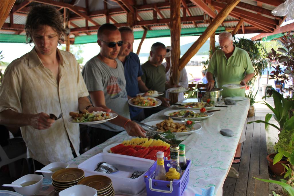 ไปที่ร้านอาหารกันต่อครับมื้อเที่ยง พอดีกับที่ลูกเรือทัวร์จากสมุย มาเล่นน้ำรอบเช้า และมาแวะกินข้าวที่ร้านป้าน้อยครับ