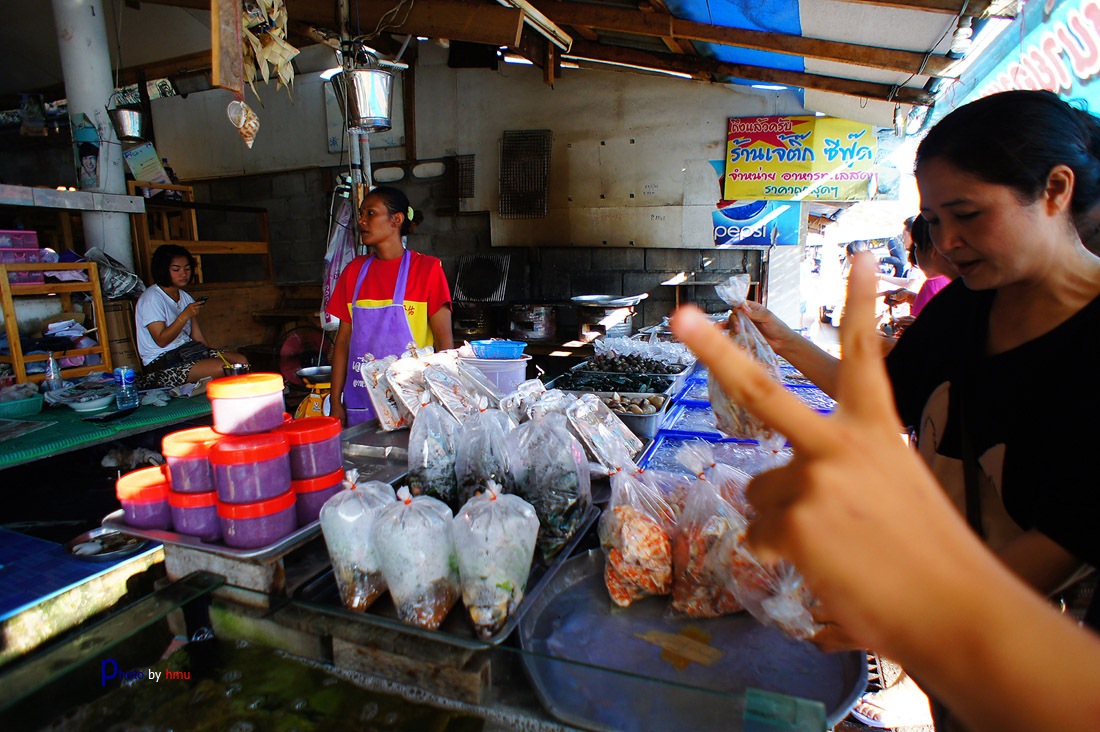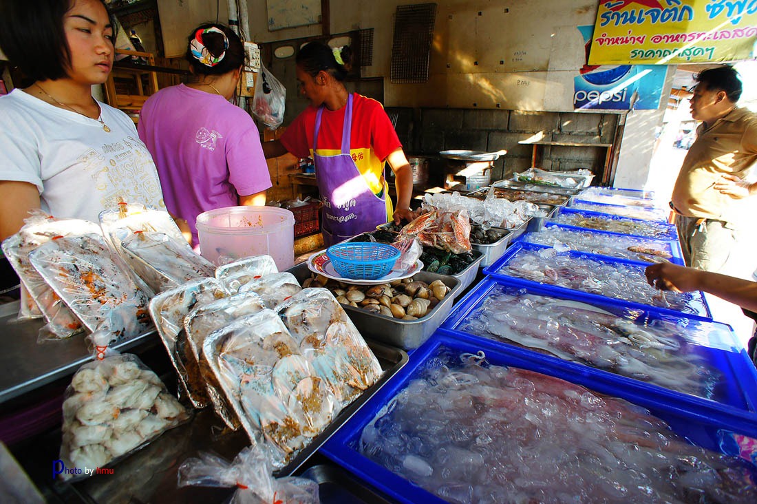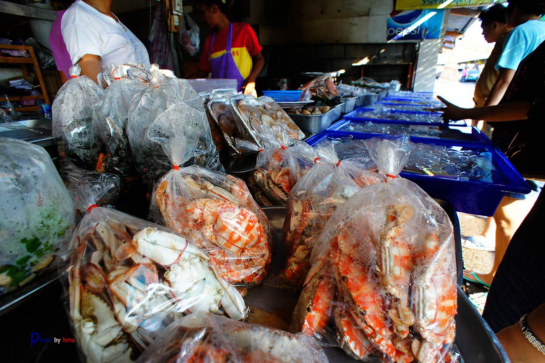ระหว่างรอ แม่ค้าลวกหอยแครง นึ่งปูม้า ย่างแมงดาทะเล. ส่วนกุ้งกับหอยหวาน เอาแบบสำเร็จ