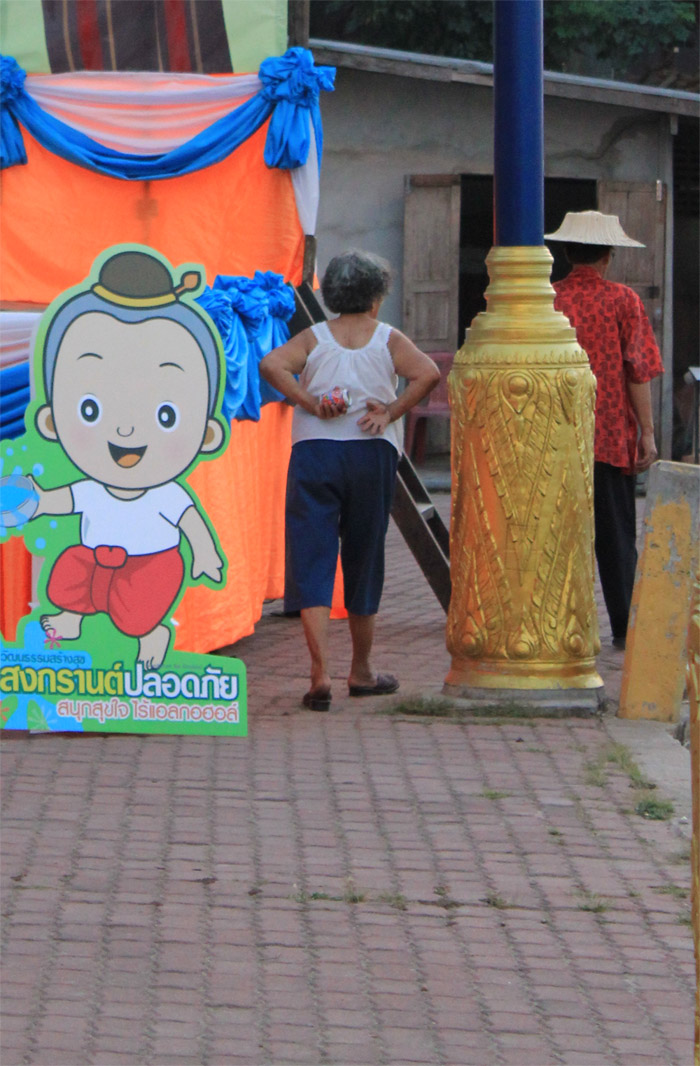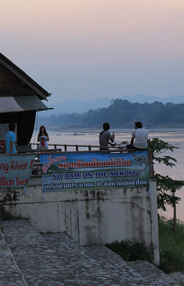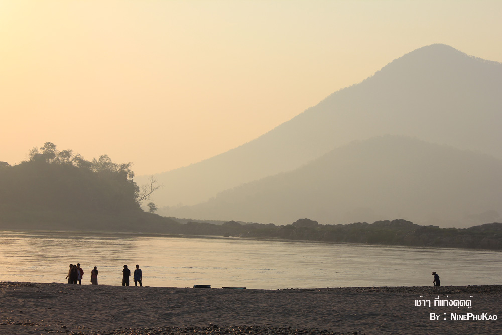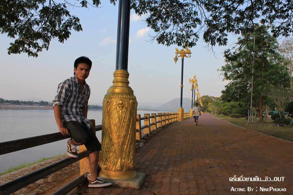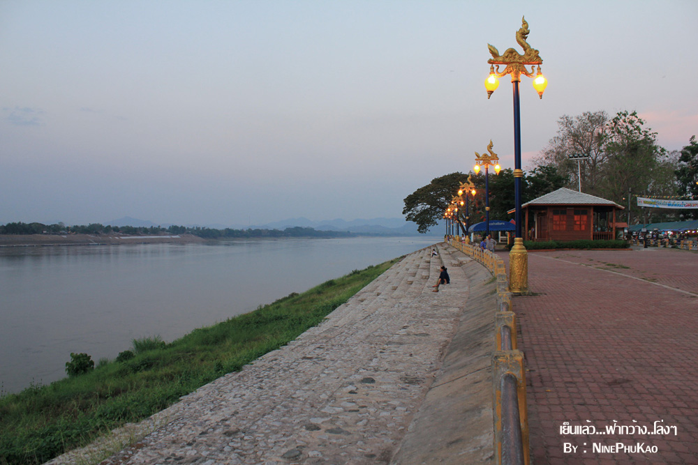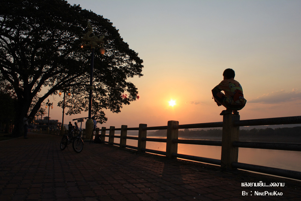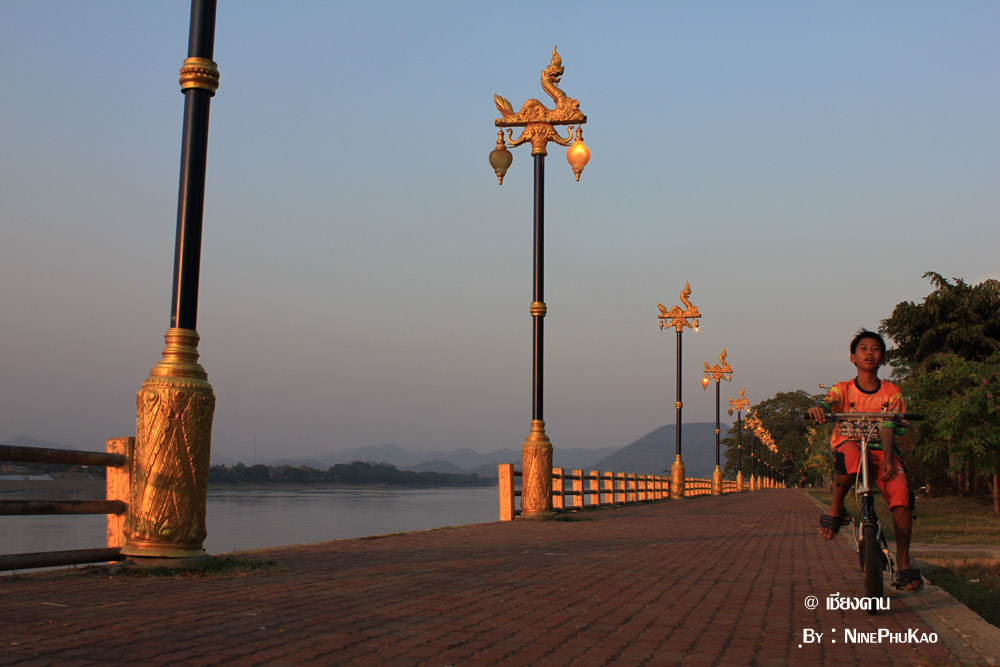 ณ ถนนชายโขงเรียบริมโขง ยามเย็นย่ำจะมีบรรดาผู้คน เมืองนี้มาเดินเล่น กินลม และออกกำลังกาย