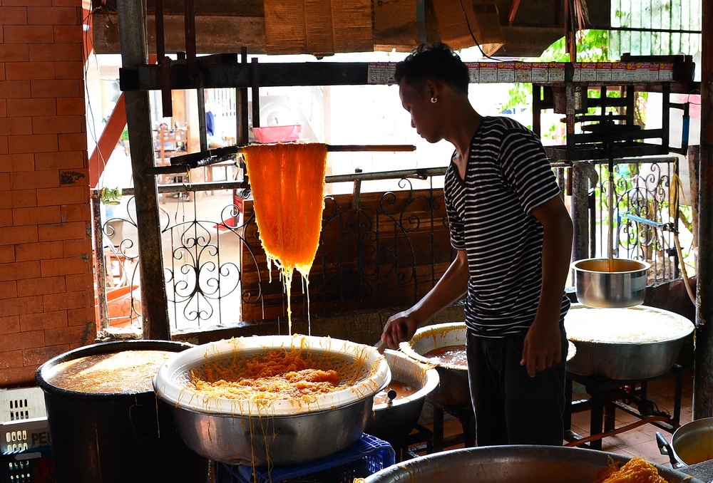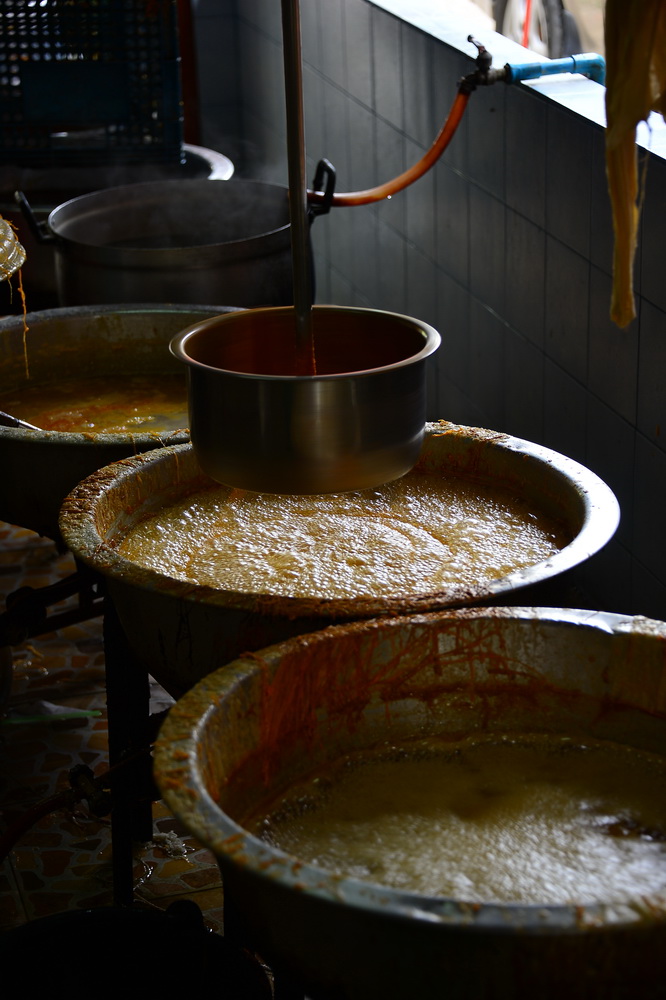 ฝอยทอง หลังจากต้มกับน้ำเชื่อมแล้วก็จะถูกช้อนขึ้นมาเสด็จน้ำเชื่อม
