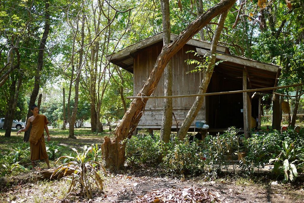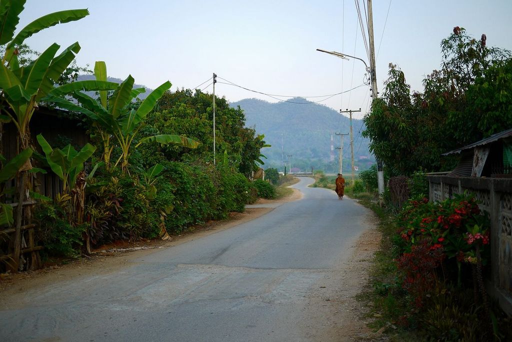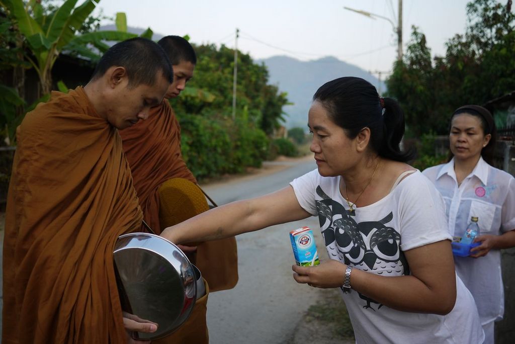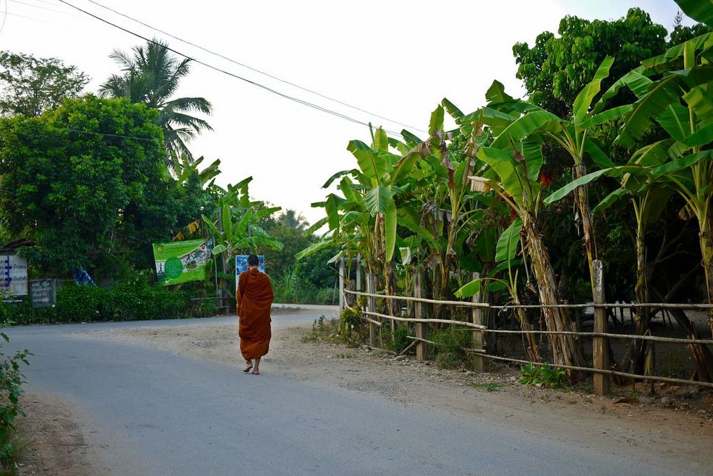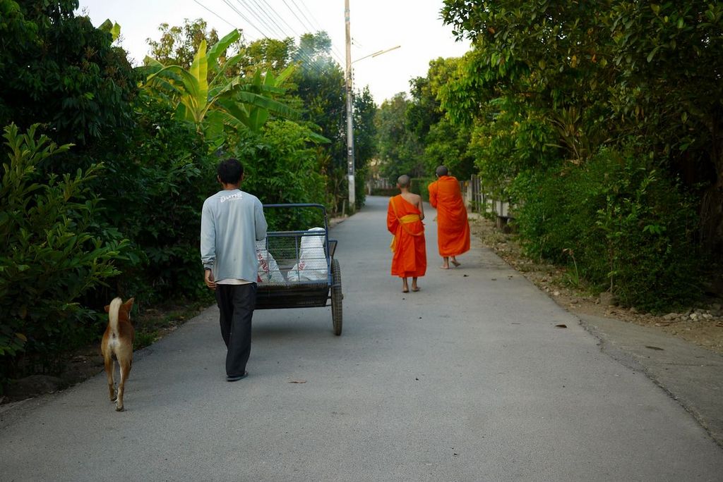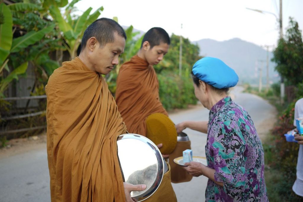 ตอนเช้าเดินบิณฑบาตไปบ้านโยมยาย ระยะทางไปกลับประมาณ 4 กม.