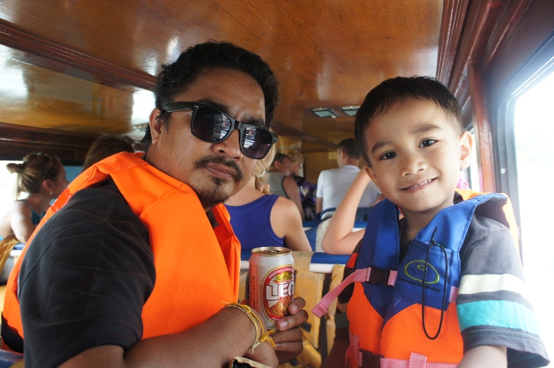เด็กๆเตรียมตัวถึงเกาะล้านแล้ว เจ้าหนุ่มๆในทีมงานถึงเกาะลงกันหมดเหลือแต่ผมกับครอบครัวอยู่บนเรือ Hello พี่ปรียังอยู่บนเรือหรือเปล่าพวกผมลืมกระติก เอ้าเวรละกู มือหนึ่งอุ้มลูกชาย หลังสะพายเป้ มือซ้ายถือกระติก รวมแล้วเกือบสามสิบกิโล แล้วตรูจะเอามือไหนจับราวเนี่ย ช่วงเดินบนเรือใหญ่ยังพอโคลงเคลงได้ ช่วงลงเรือเล็กเข้าฝั่งนะสิ บอกได้คำเดียว ย๊ากๆๆๆๆ