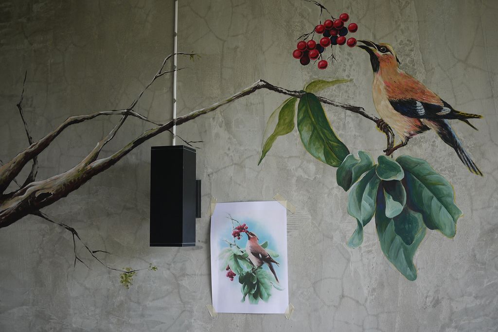 ฝนังเป็นปูนดิบค่ะ ออกแบบและวาดโดยรุ่นน้องจบศิลปะมา ไม่คิดตังค์ซักกะบาทเลยค่ะ