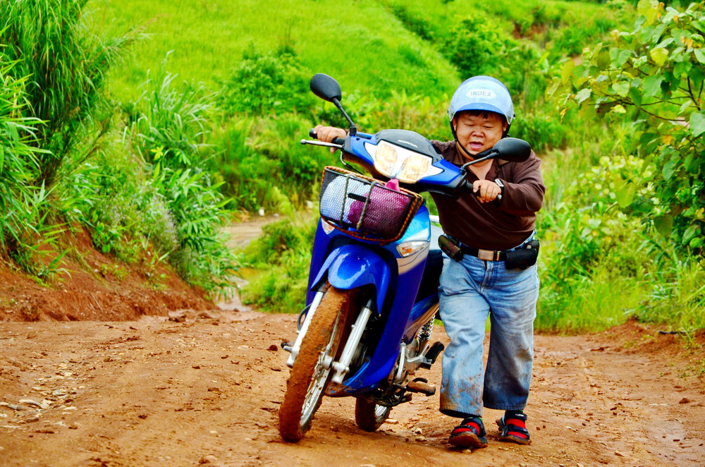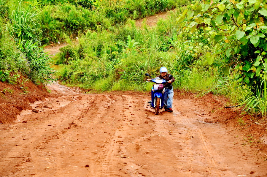 ผมก็ไปมาครับ แต่เข้าไม่ได้ ฝนตก หน้าดินเป็นหนังหมู ขี่ล้อหน้าไปทางล้อหลังไปอีกทางทาง บังคับรถไม่ได้ ขาก็ไม่ถึง จึงเป็นสภาพนี้