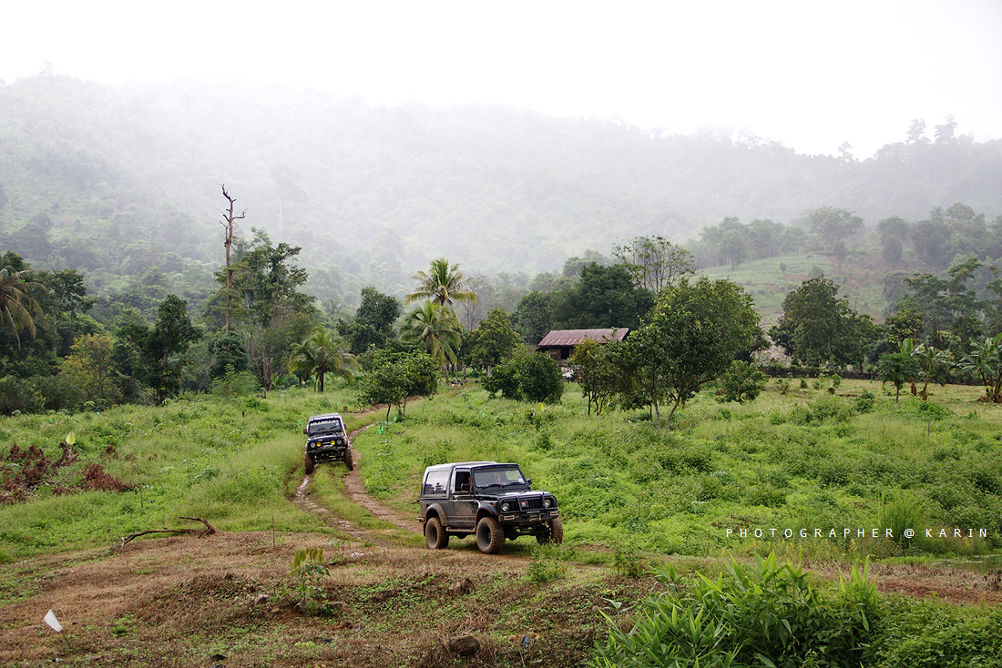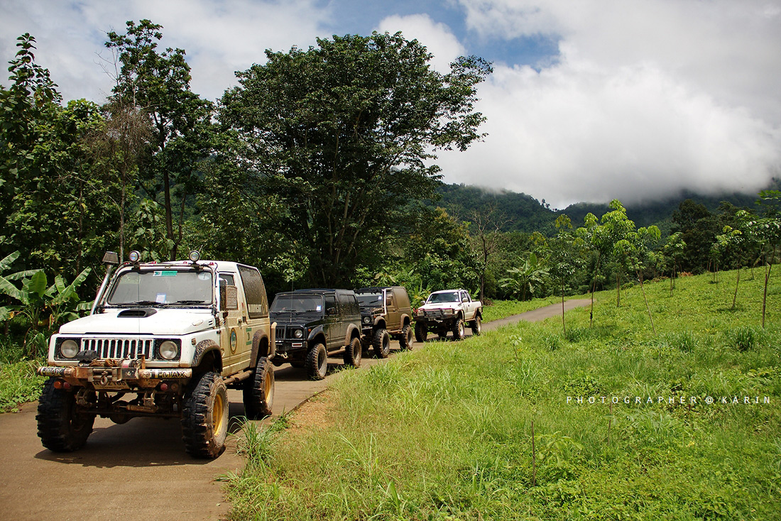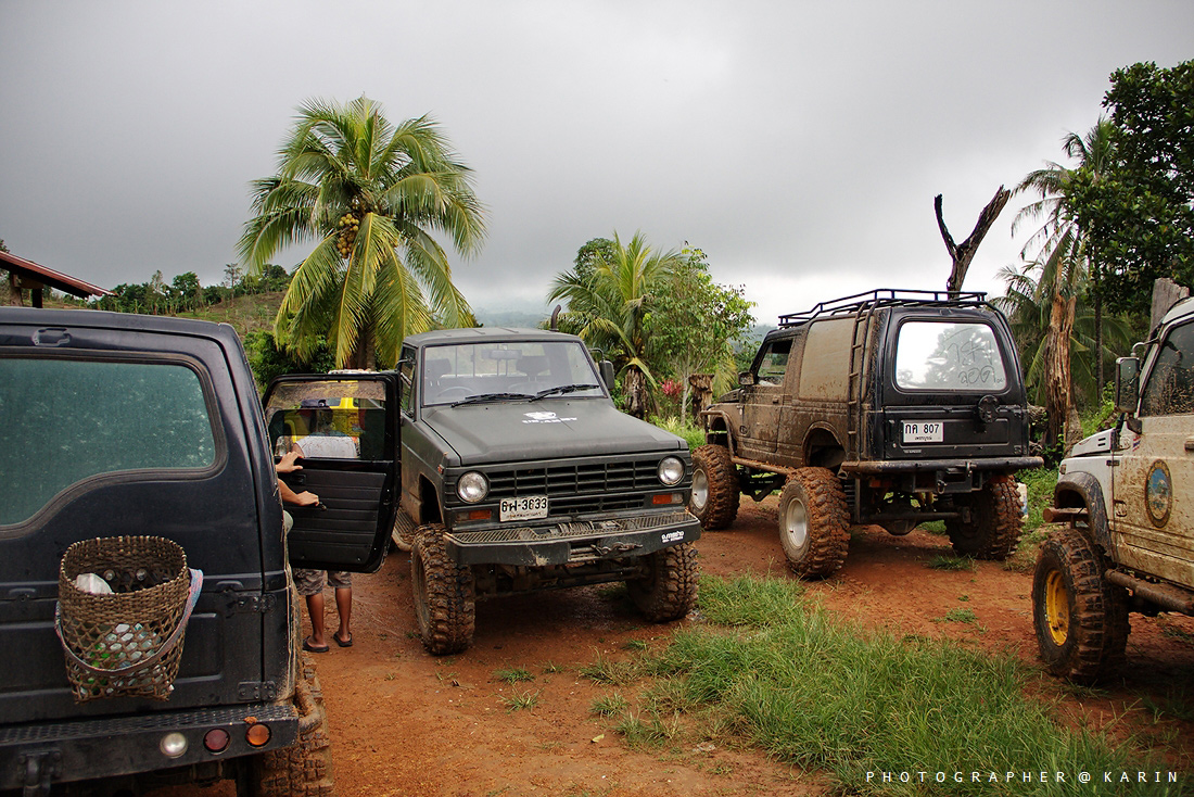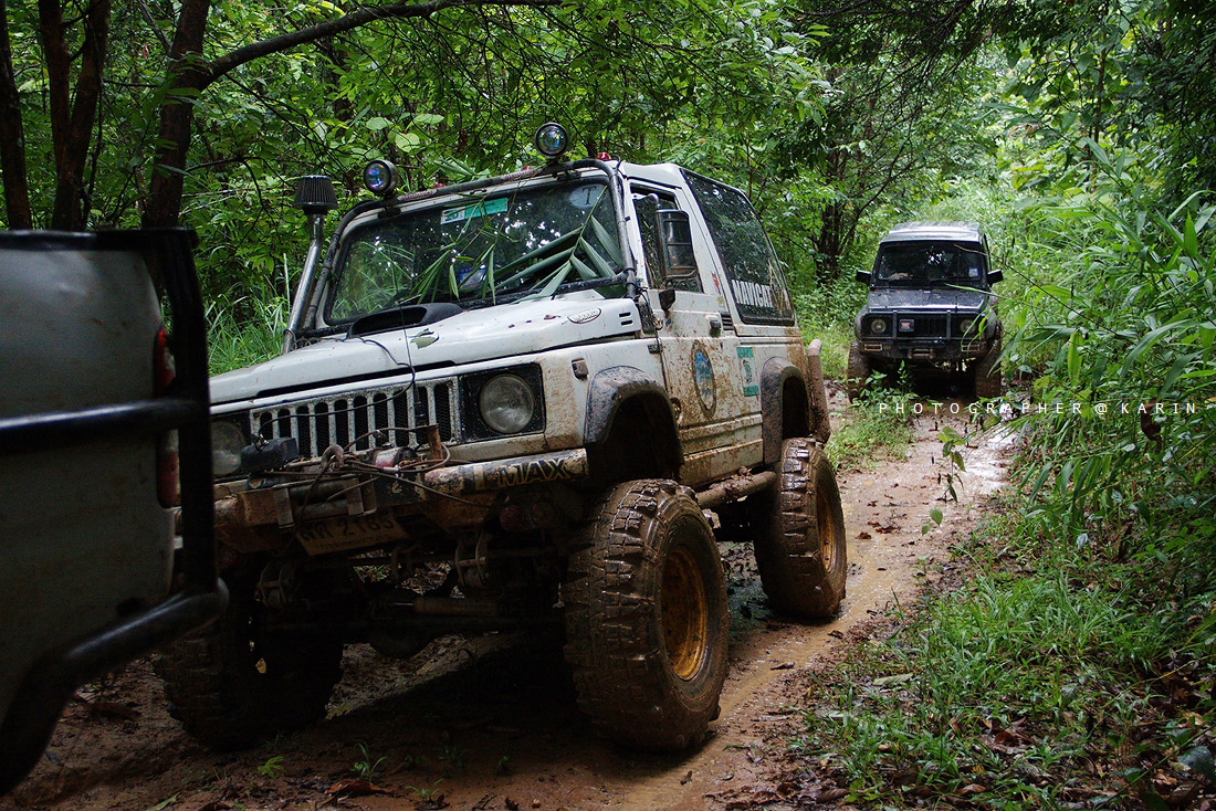 พอเดินทางมากันเรื่อยๆ ฝนก็เริ่มตกหนัก ทางก็เริ่มชันขึ้นเรื่อยๆ ได้ยินเสียง ว มาจากด้านหลัง บอกว่าไม่ไหวเป็นคาริเบี้ยนสีดำ ยาง 31 ขอหยุดพันโซ่ก่อน เพราะปั่นขึ้นไม่ไหว พอแก้ปัญหาเสร็จก็เดินหน้ากันต่อ ได้ยินเสียงจาก จิมนี่เหลืองบอก ขอลองเนินนี้หน่อยอย่าพึ่งตามมา เพราะทางลื่นและชันมาก ได้ยินเสียงเครื่องยนต์ทำงานสนั่นป่ากันเลย และก็เป็นเนินนี้นี่แหละ ที่คาริเบี้ยนขาวล้อเหลืองผม โดนวินส์แรกกันซะเลย