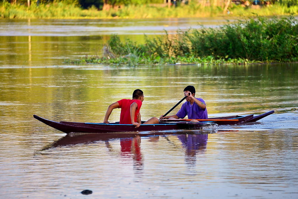 มีเรือพายมาพอดี แถมพายทวนน้ำอีก นะครับ