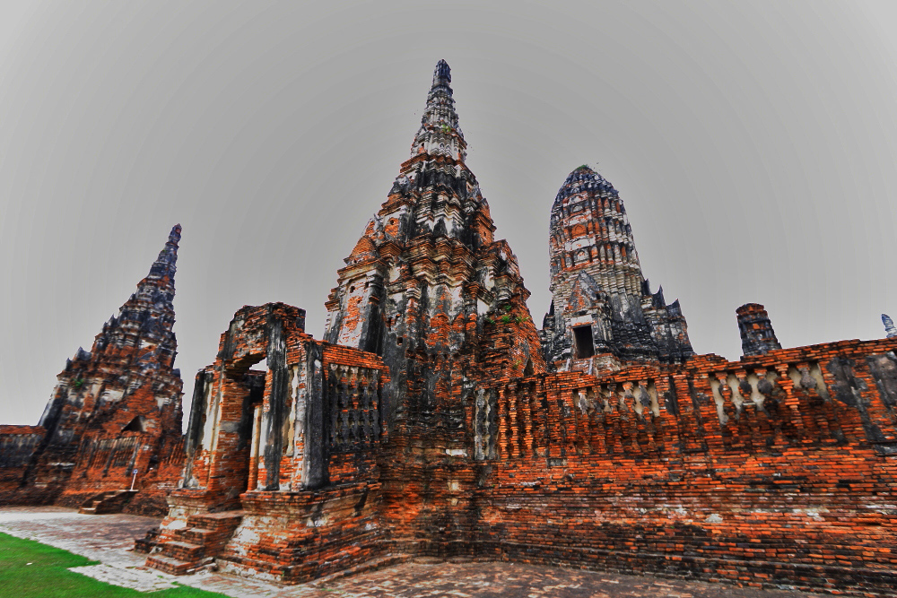 วัดไชยวัฒนาราม มีปรางค์ประธานและปรางค์มุมอยู่บนฐานเดียวกัน พระปรางค์ประธานนำรูปแบบของพระปรางค์สมัยอยุธยาตอนต้นมาก่อสร้าง แต่ปรางค์ประธานที่วัดไชยวัฒนารามทำมุขทิศยื่นออกมามากกว่า บนยอดองค์พระปรางค์ใหญ่อาจเคยประดิษฐานพระเจดีย์ขนาดเล็ก สื่อถึงพระเจดีย์จุฬามณีบนยอดเขาพระสุเมรุ รอบพระปรางค์ใหญ่ล้อมรอบไปด้วยระเบียงคตที่เดิมนั้นมีหลังคา ภายในระเบียงคตประดิษฐานพระพุทธรูปปูนปั้นปางมารวิชัยที่เคยลงรักปิดทองจำนวน 120 องค์ เป็นเสมือนกำแพงเขตศักดิ์สิทธิ์