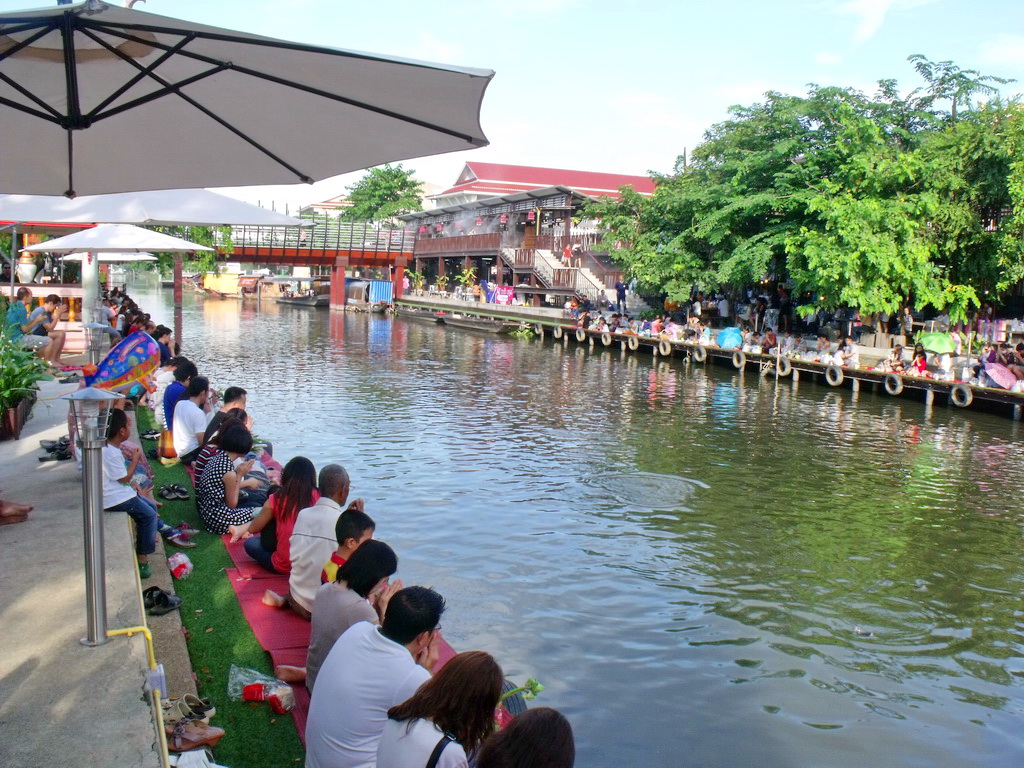 คนที่อยู่ตรงข้ามตลาดน้ำขวัญเรียม รอตักบาตรด้วยใจจดจ่อ
