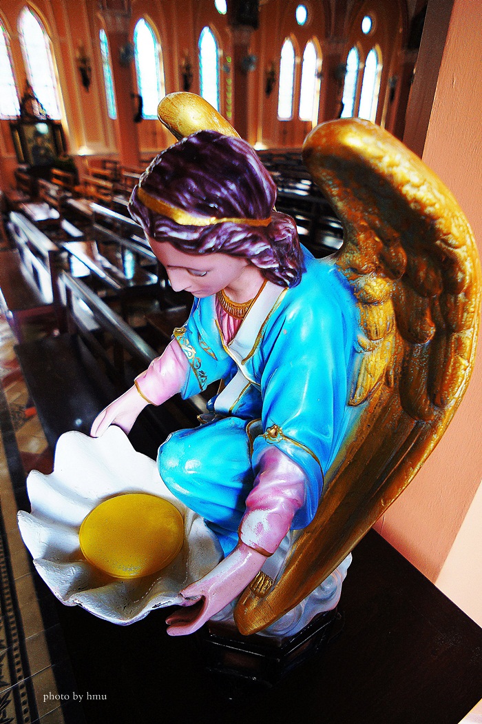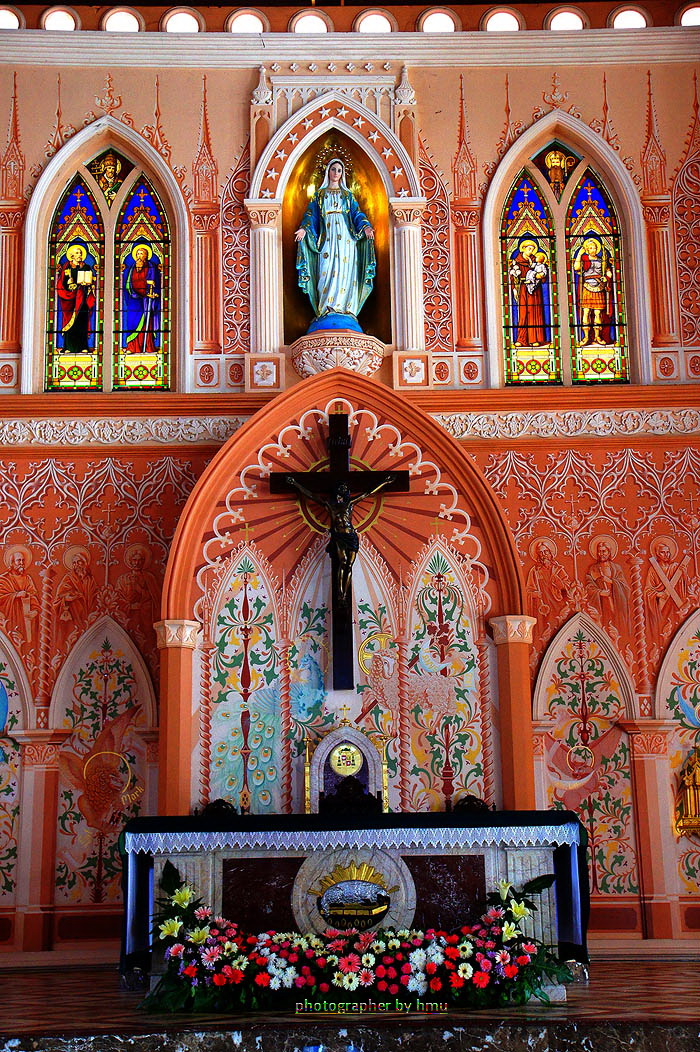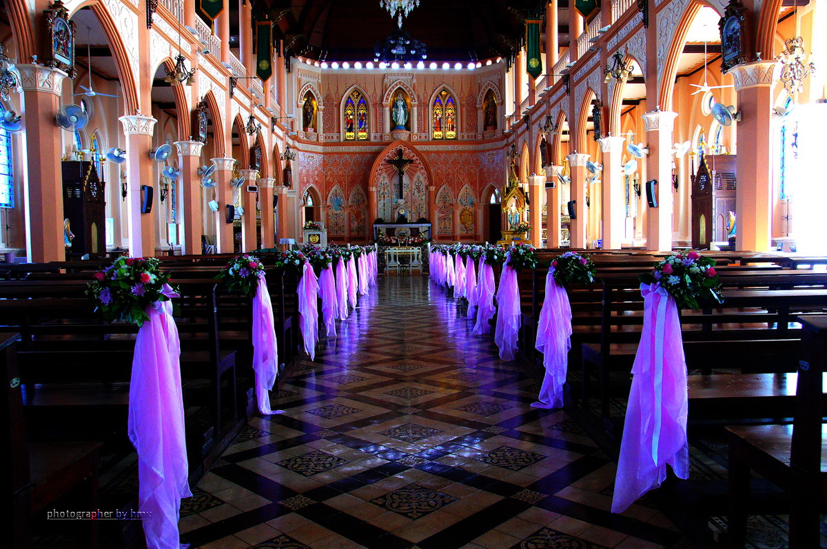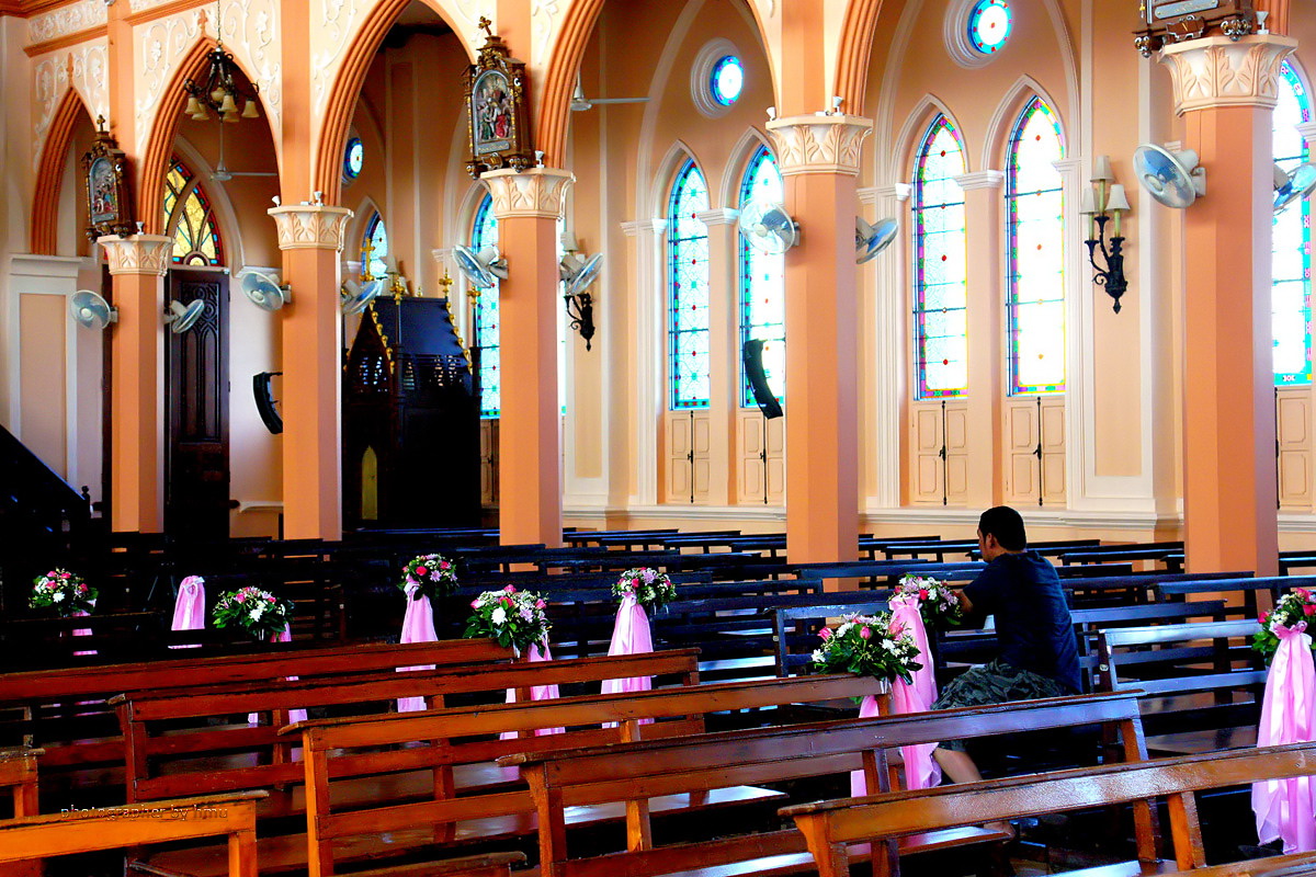 บรรยากาศภายในโบสถ์เป็นสีส้มๆ อมชมพู ดูอุ่นๆ หรูหรา และเงียบสงบ