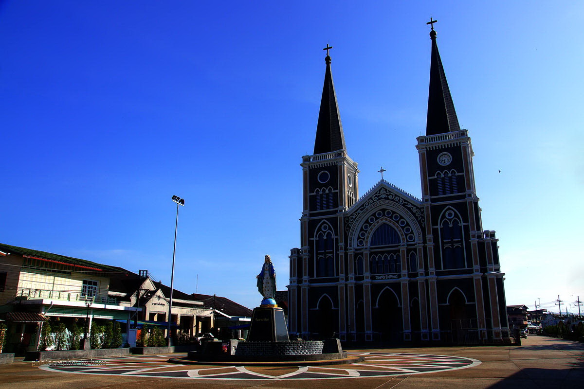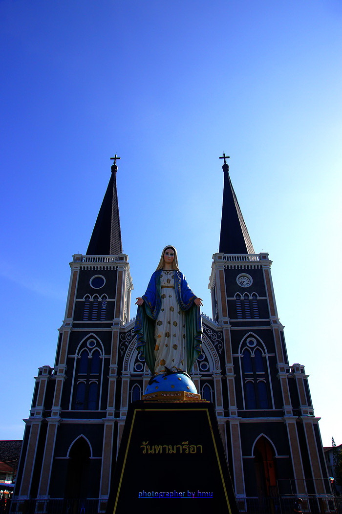 ชมด้านนอกกันก่อนครับ อาสนวิหารพระนางมารีอาปฏิสนธินิรมล จันทบุรี หรือที่คนจันท์ส่วนใหญ่เรียกกันติดปากว่า “วัดโรมัน”แต่ ก่อนนั้นลานด้านหน้าโบสถ์จะเป็นทางเดินตรงกลาง สองข้างทางเดินเป็นสวนหย่อม แต่ปัจจุบันได้ถูกปรับปรุงเป็นลานกิจกรรม และเป็นที่ตั้งของรูปปั้นพระแม่มารีอาล้อมรอบด้วยน้ำพุ