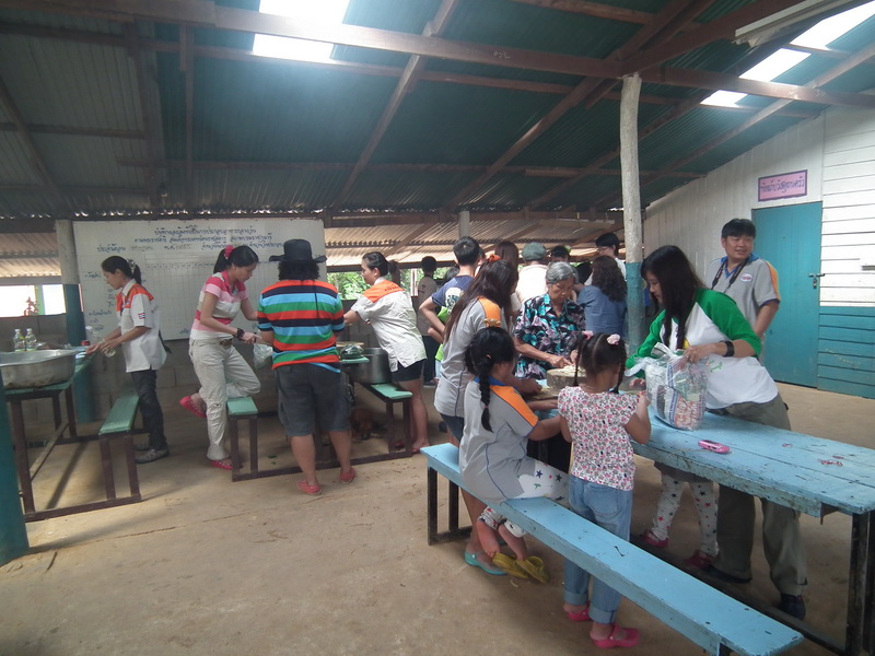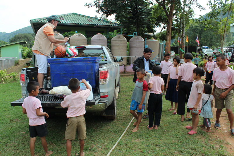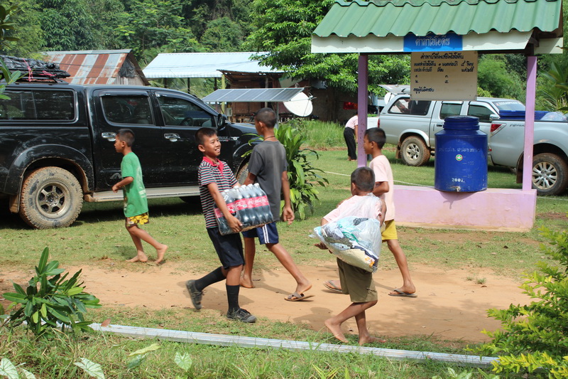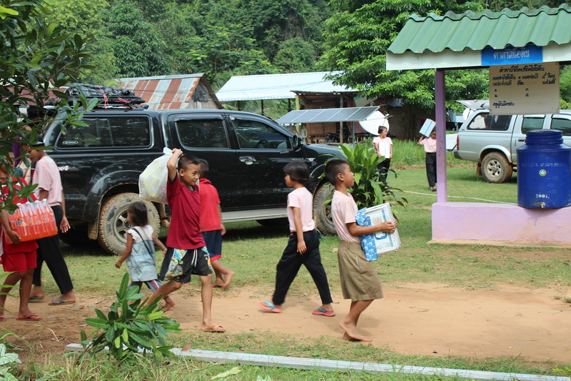 ลำเลียงสิ่งของลงจากรถ ดดยมีน้องๆนักเรียนมาช่วยขนถ่าย