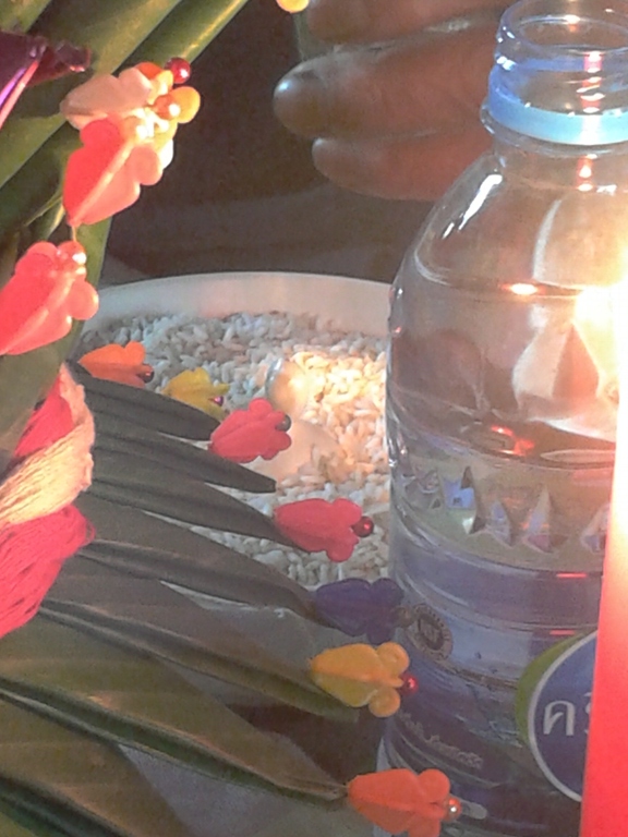 หมอขวัญจะเรียกขวัญมาคนละสามครั้ง โดยใช้วิธีเสี่ยงทายคือเอาหอยตั้งบนไข่ดิบ ในจานจะรองไว้ด้วยข้าวสารเพื่อตั้งไข่ ถ้าสามารถตั้งหอยบนไข่ได้แสดงว่าขวัญมา จากรูปถ่ายมาไม่ค่อยชัดเท่าไหร่