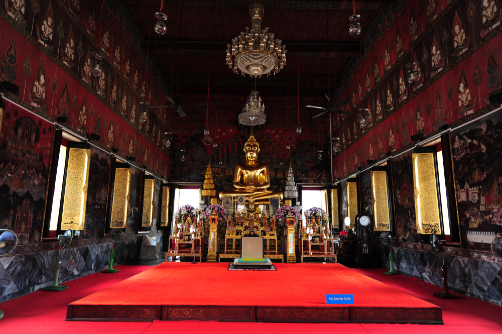 ภายในพระอุโบสถกว้างประดิษฐานพระประธานปางสมาธิองค์ใหญ่ปิดทองคำเปลวสะท้อนสีทองสุกอร่าม พระประธานองค์นี้รัชกาลที่ ๑ โปรดเกล้าฯให้สร้างครอบพระประธานองค์เดิมที่เล็กกว่าไว้ พระพุทธศิลป์ฝีมือสกุลช่างรัตนโกสินทร์ พระประธานประดิษฐานบนฐานชุกชีที่พอดีกับระดับสายตา เมื่อกราบท่านแล้วแหงนมองพระพักตร์ท่านและดูรอบๆพระอุโบสถจะได้ความรู้สึกอิ่มตาสบายใจ