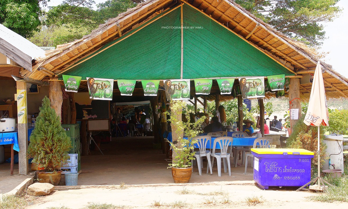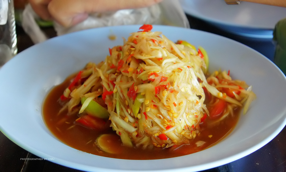 เลยจนถึงตัวอำเภอ เห็นร้านดูเหมือนเพิ่งเปิดใหม่ มีลูกค้าหนึ่งโต๊ะ เลียวเข้าไปคราวนี้สมหวัง ระหว่างรอ แกะส้มตำสัญจร ที่เราพามาจากวัดพระโตมากินแก้หิวก่อน