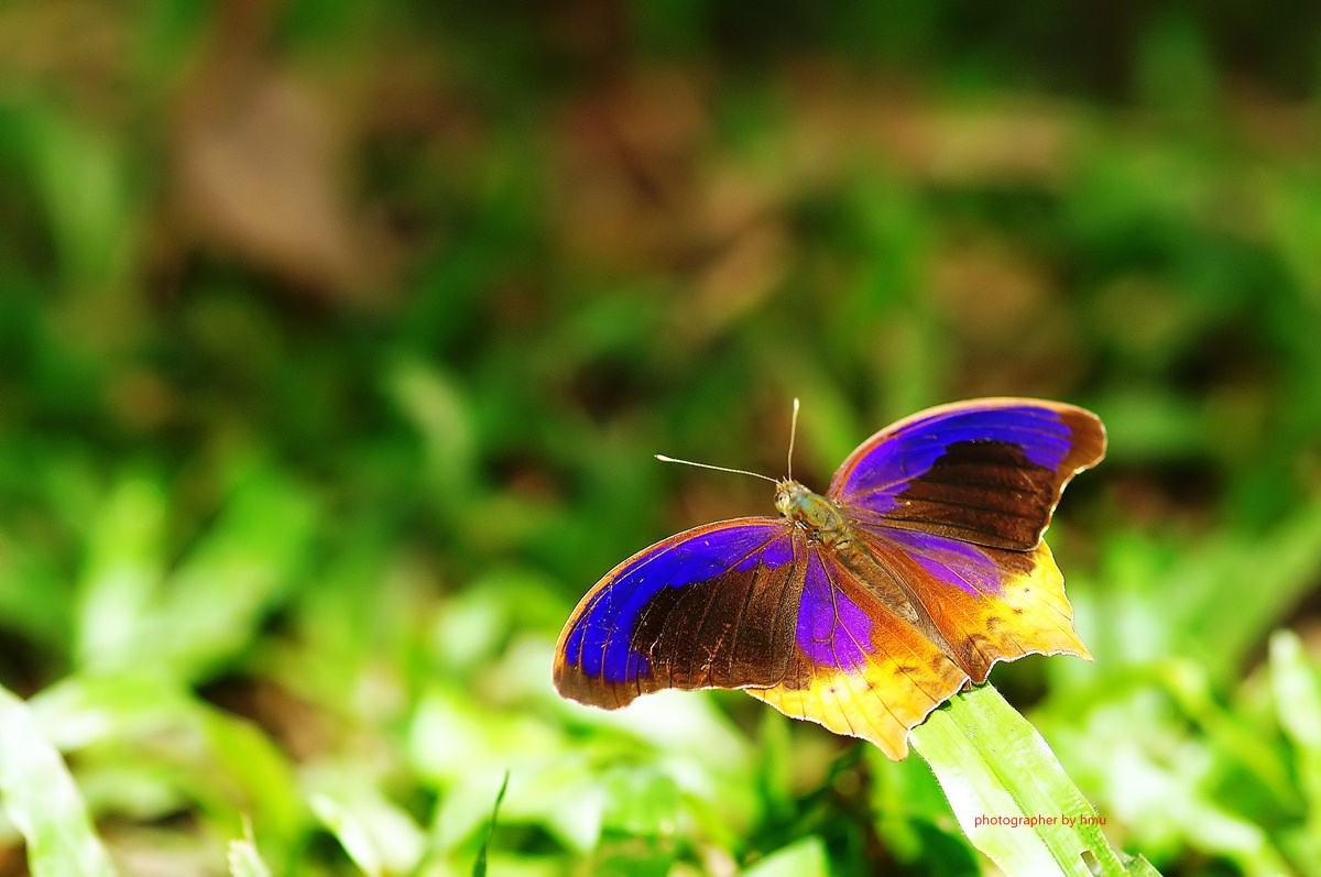 ลักษณะ : ปีกบน -พื้นปีกมีสีม่วงเข้มขอบปีกโและเส้นปีกโดยรอบทั้งคู่บนและล่างมีน้ำตาลมีสีดำแต้มเป็นแผ่นใหญ่ช่วงกลางปีกพาดทั้งปีกบนและปีกล่างช่วงปลายปีกท้ายสุดมีสีเหลืองแถบใหญ่ระบาย พาดข้ามทั้ง 2 ฝั่ง สังเกตเห็นได้ชัดเจน