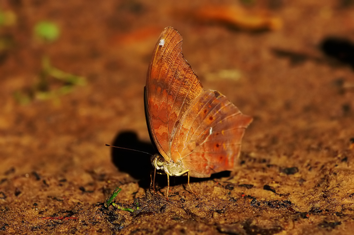 ลักษณะ : ปีกบน เพศผู้มีพื้นปีกสีน้ำตาลส้ม ปีกทั้ง 2 คู่มีจุดและเส้นสีดำจางๆ เพศเมียมีสีพื้นปีกออกไปทางน้ำตาลอมเขียวและมีลวดลายคล้ายเพศผู้ ปีกล่าง คล้ายปีกบนแต่สีอ่อนกว่า เห็นจุดและลวดลายจางๆ