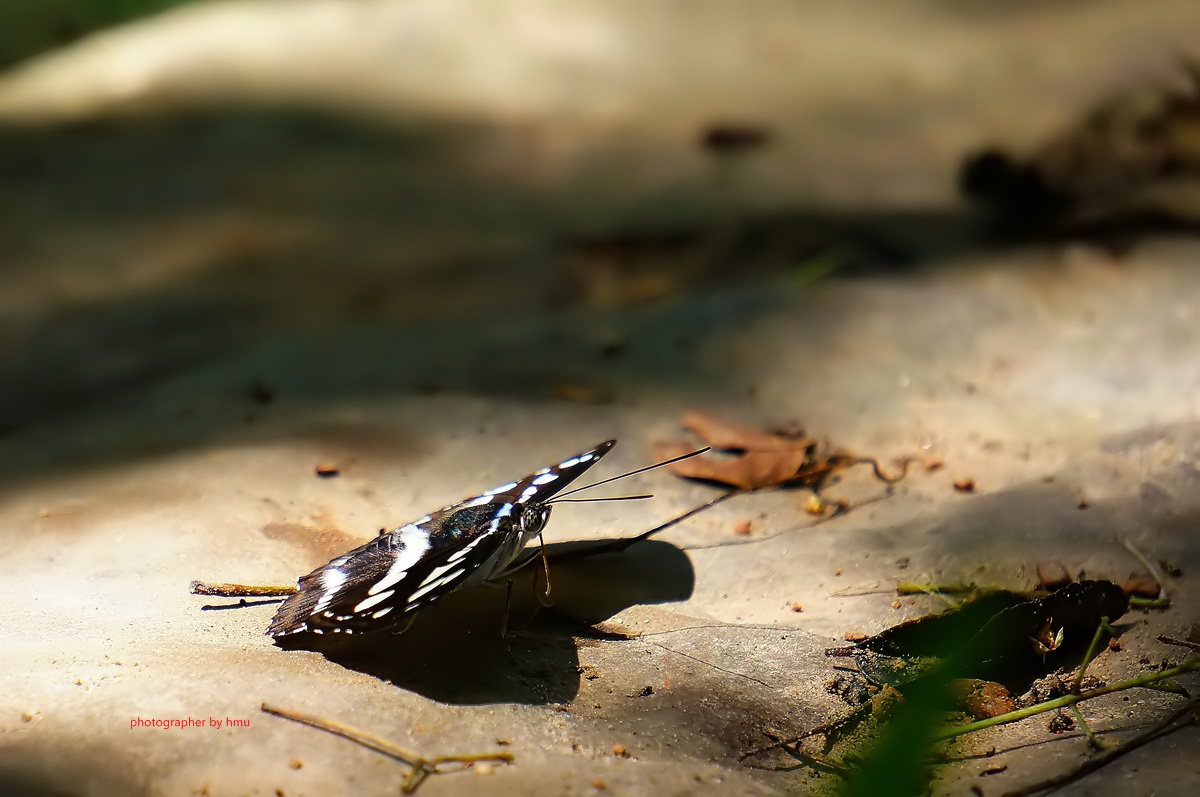 ลักษณะ : ปีกบนพื้นปีกสีดำ มีแถบสีขาวพาดกลางยาวต่อเนื่อง แต่ลายจะขาดเป็นช่วงๆ มีลายแต้มสีขาวจางๆเรียงกันตลอด ขอบปีกด้านปลายปีกช่วง ขอบปีกด้านบนจะมีสีเหลือบเขียว ขี้ม้าจางๆ พื้นปีกสีดำ-น้ำตาลไหม้ ไม่มีลวดลวยใดๆ แต่สีสัน ออกเหลือบๆ คล้ายผ้ากำมะหยี่ ด้านข้าง ขอบปีกมีสีขาวแต้ม เป็นรอยประปีกล่าง เหมือนกับปีกบน แต่สีจางกว่าเล็กน้อย