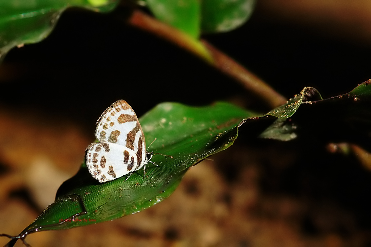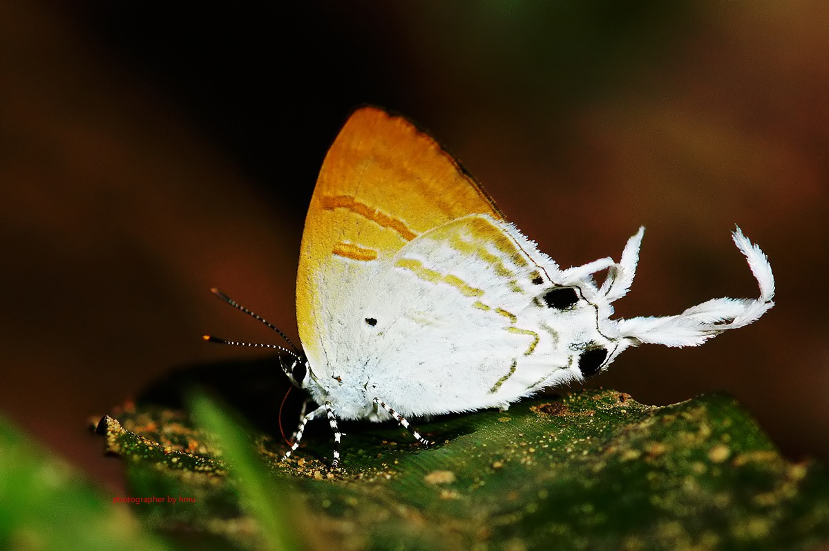 ลักษณะ : ปีกบน เพศผู้มีพื้นปีกสีขาว มุมปลายปีกหน้าของปีกคู่หน้ามีแถบสีส้มขนาดใหญ่ เพศเมียคล้ายเพศผู้ แต่มีแต้มสีดำที่ขอบปีกด้านข้างของปีกคู่หลังปีกล่าง คล้ายกันทั้ง 2 เพศ พื้นปีกสีน้ำตาลอ่อนลายๆ คล้ายใบไม้แห้ง