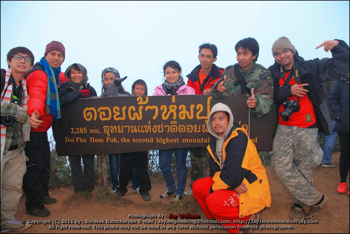 เช้ามืดตื่นตี 4 เดินขึ้นยอดใช้เวลาประมาณ 1 ชั่วโมงกว่าๆก็ถึง เสียดายฟ้าปิดหมอกลงจัดไมไ่ด้เห็นวิวอะไีร แต่ก็เจอพวกเพื่อนๆกลุ่มเดินป่าข้างบน เลยถ่ายรูปหมู่กันหน่อย